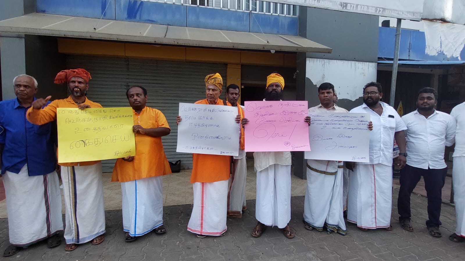 யாழ்ப்பாணம் இந்துக் கல்லூரி மைதானத்துக்கு அருகில் இன்றைய தினம் ஞாயிற்றுக்கிழமை ஒன்று கூடிய சைவ அமைப்பின் பிரதிநிதிகள் குறித்த போராட்டத்தில் ஈடுபட்டன.