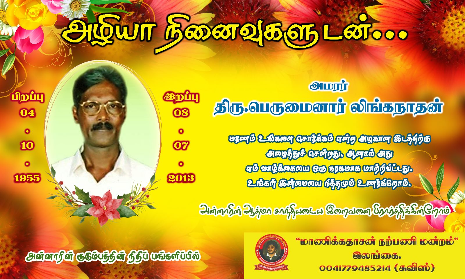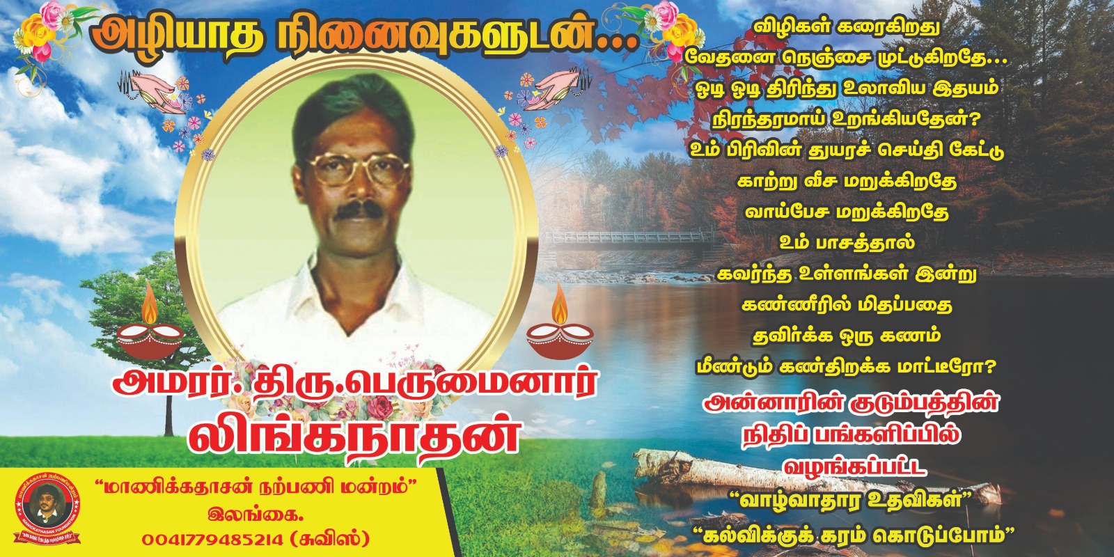 மாணிக்கதாசன் நற்பணி மன்றமும் தாயக சொந்தங்களோடு இணைந்து நன்றியைத் தெரிவித்துக் கொள்வதோடு, இறையடி சேர்ந்த அமரர் பெருமைனார் லிங்கநாதன் அவர்களின் ஆத்மா சாந்தியடைய தாயக உறவுகளுடன் இணைந்து மாணிக்கதாசன் நற்பணி மன்றமும் எந்நாளும் இறைவனை இறைஞ்சு வேண்டுகிறோம்.