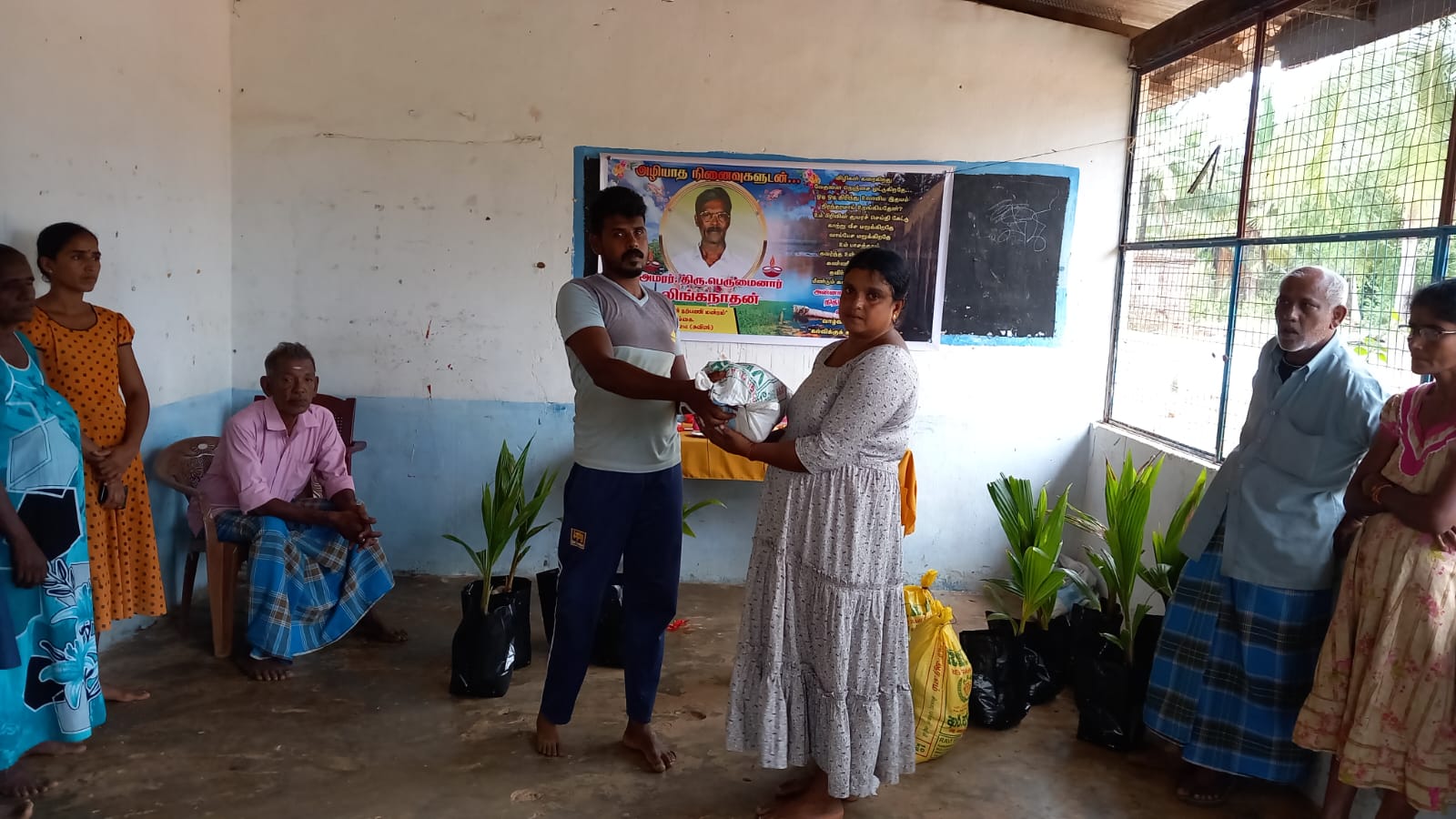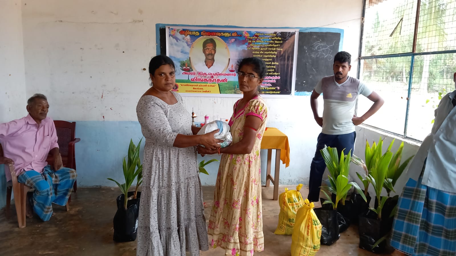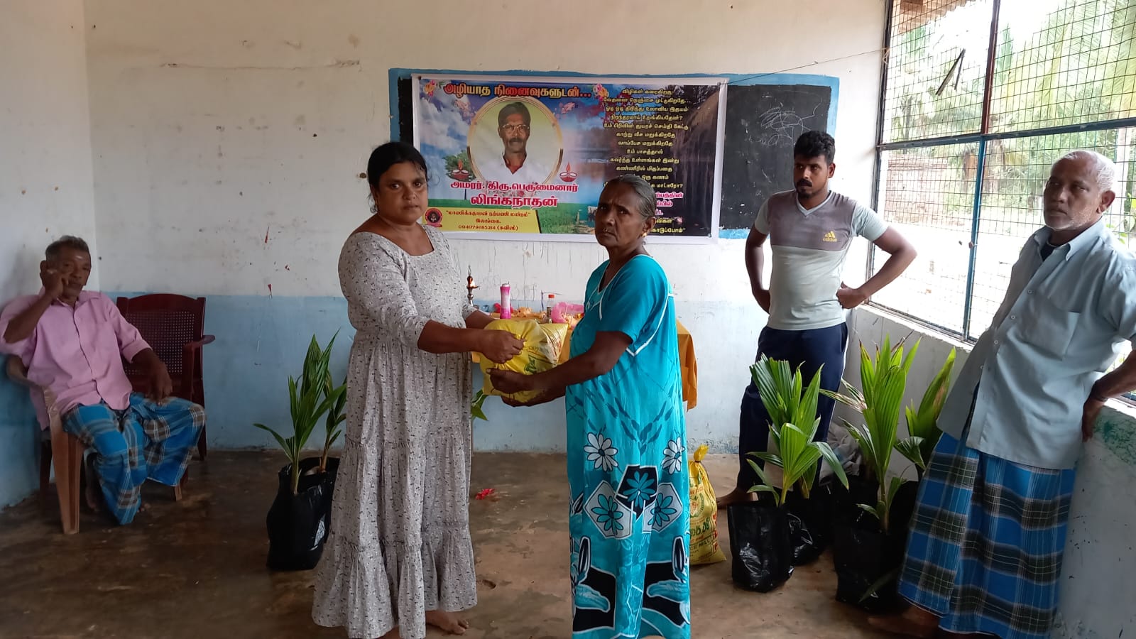 அதனைத் தொடர்ந்து மேற்படி பெறுமதியான உலருணவுப் பொருட்கள் அடங்கிய பொதிகள் வழங்கி வைக்கப்பட்ட மற்றும் அன்னாரின் நினைவாக பயன்தரு நல்லின தென்னைமரக் கன்றுகளும் வழங்கி வைக்கப்பட்ட நிகழ்வானது அமரர் பெருமைனார் லிங்கநாதன் அவர்களின் மனைவி மக்கள், மருமக்கள், பேரப்பிள்ளைகள் மற்றும் உற்றார், உறவினர்கள் சார்பாக அன்னாரின் மகனான பிரான்சில் வசிக்கும் திரு.தயாளன் அவர்களின் முழுமையான நிதிப் பங்களிப்பில் வழங்கப்பட்டது. மேற்படி தயாளன் கழகத்தின் பிரான்ஸ் கிளையின் நிர்வாகப் பொறுப்பாளர் என்பது குறிப்பிடத்தக்கது.