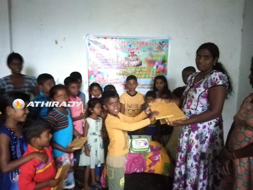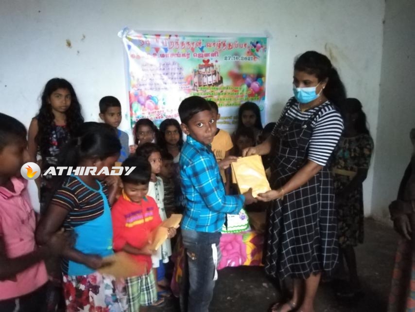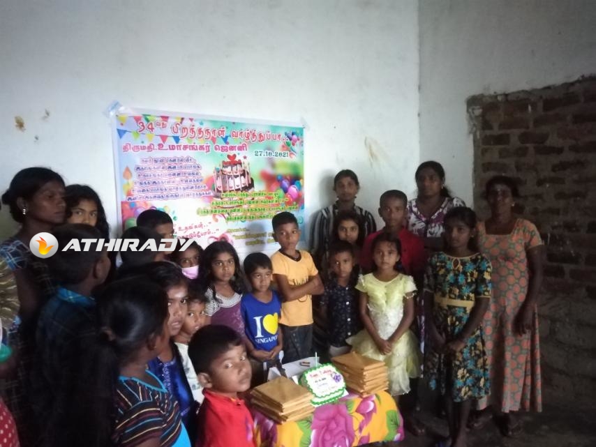 பிரான்ஸ் பாரீசில் வாழும் திருமதி உமாசங்கர் ஜெனனி அவர்களின் பிறந்தநாள் அவர்களது நிதிப் பங்களிப்புடன் தாயக கிராமமொன்றில் கொண்டாடப்பட்டது. மாணிக்கதாசன் இலவச மறுமலர்ச்சி கல்விக் கூடத்தின் பொறுப்பாசிரியையும், முன்பள்ளிகளுக்கான இணைப்பாளருமான திருமதி வேஜினி அவர்களின் ஒழுங்குபடுத்தலில் மாணவர்கள், பெற்றோர்கள், சமுர்த்தி சங்கத்தின் செயலாளர் திருமதி மது.சுலக்சனா, பொருளாளர் திருமதி மணிவண்ணன் கலைவாணி ஆகியோர் கலந்து கொண்டு பிறந்தநாள் பாட்டுப் பாடி கேக் வெட்டி மாணவர்களின் பெரும் சந்தோசத்தின் மத்தியில் கோலாகலமாக கொண்டாடப்பட்டது.