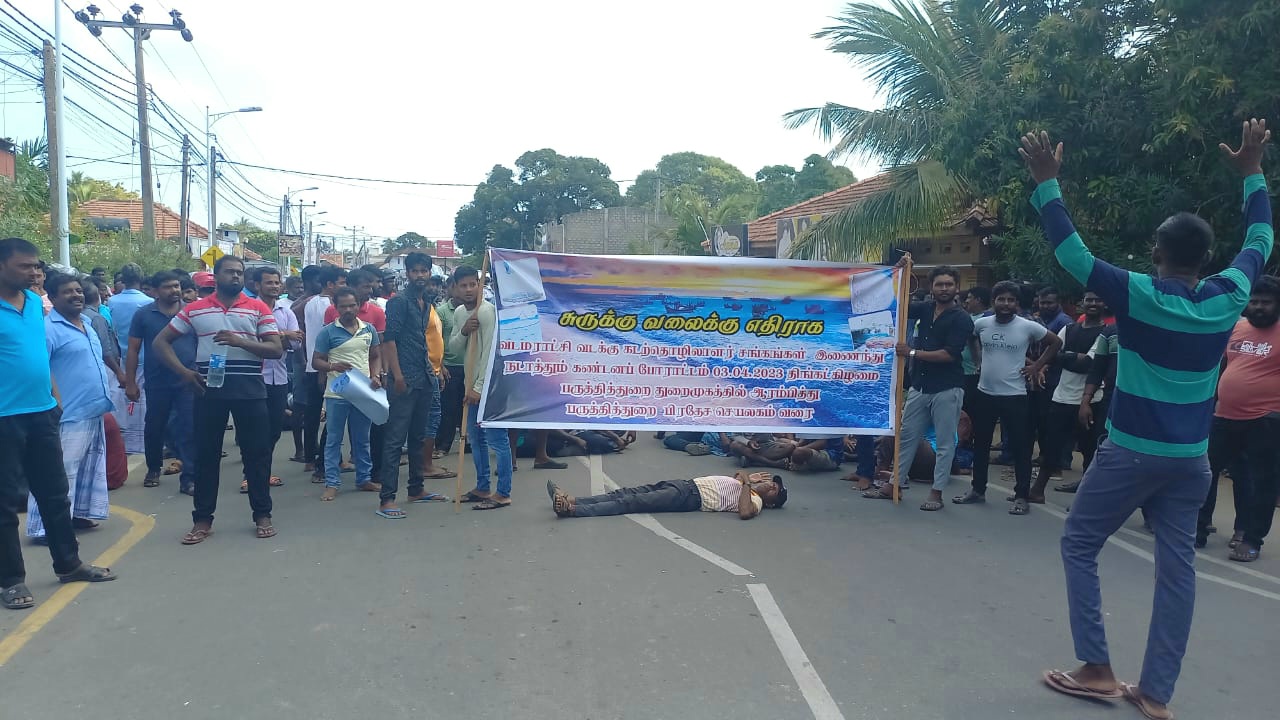 சுருக்கு வலை உட்பட்ட சட்ட விரோத கடற்றொழில்களை தடுத்து நிறுத்துமாறு கோரி வடமராட்சி வடக்கின் 14 கடற்றொழிலாளர் சங்கங்களால் யாழ்ப்பாணம் – பருத்தித்துறை பிரதேச செயலகம், பருத்தித்துறை வீதியை முற்றுகையிட்டு இன்றையதினம் போராட்டம் முன்னெடுக்கப்பட்டது.