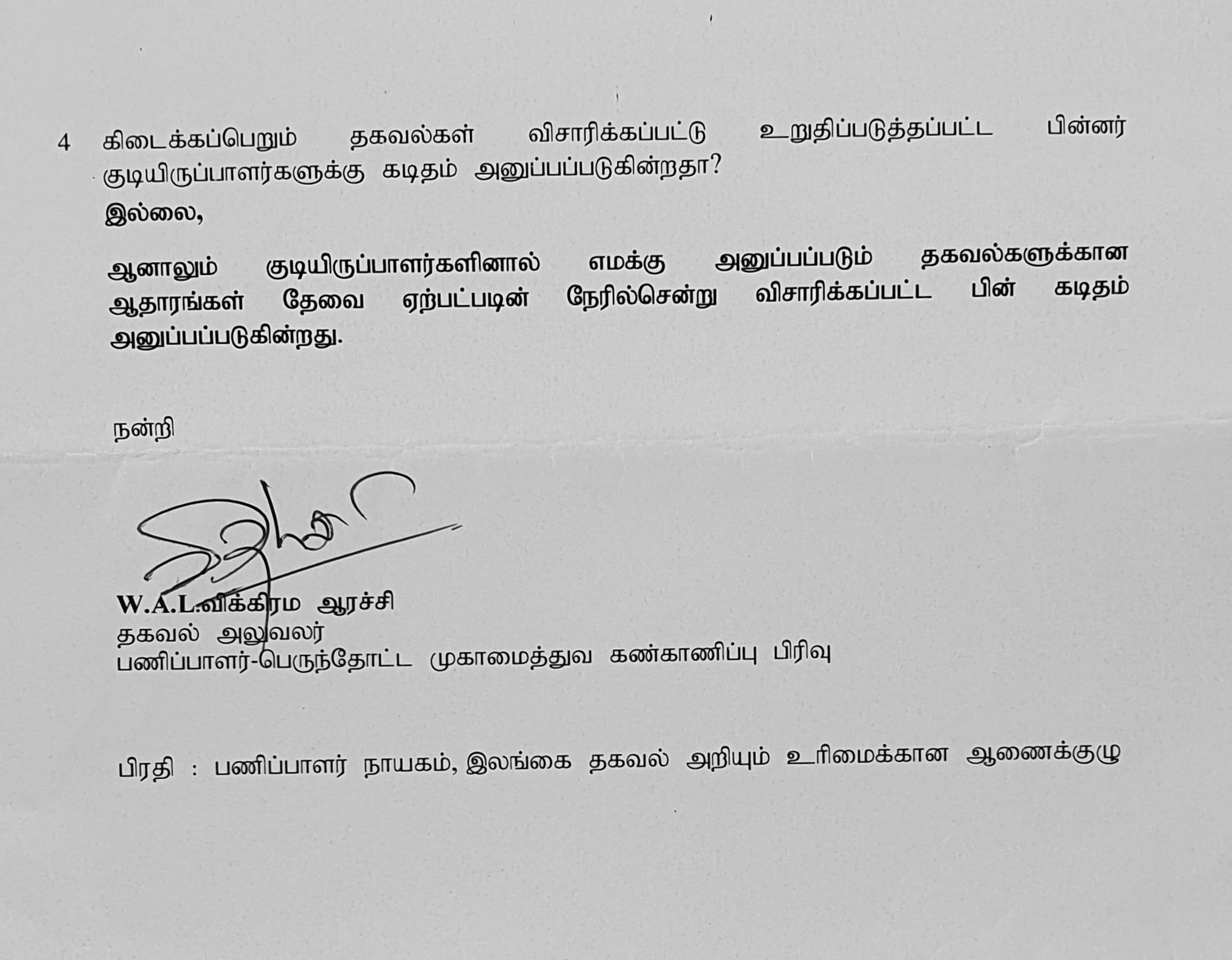 ஆனால் எனக்கு இலகுவில் பதில்கள் கிடைக்கவில்லை. அதையடுத்து நான் தகவல் வழங்கும் ஆணைக்குழுவுக்கு மேன்முறையீடு செய்தேன். விண்ணப்பங்களை நான் அனுப்பிய காலம் 2022 ஒன்பதாம் மாதமாகும். எனினும் ஆணைக்குழுவின் உத்தரவுகள், விசாரணைகளின் பின்னர் சுமார் ஒரு வருட காலத்தின் பின்னர் 2023 ஆம் ஆண்டு நவம்பர் மாதம் பெருந்தோட்ட அமைச்சினால் எனது சில கேள்விகளுக்கு மாத்திரம் பதில் வழங்கப்பட்டிருந்தன.