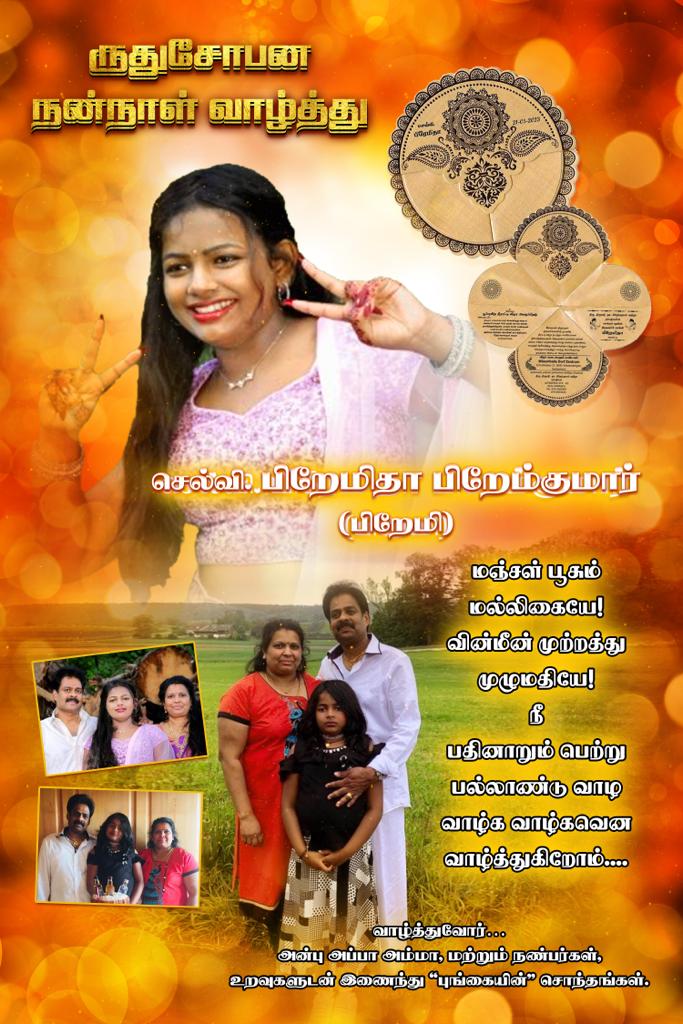 இதேவேளை புங்குடுதீவில் பெருங்காடு, இறுப்பிட்டி ஆகிய பிரதேசங்களைப் பிறப்பிடமாகவும், சுவிஸ் சூரிச் பிரதேசத்தில் வாழ்பவர்களுமான “பிறேம், சுஜி” என எல்லோராலும் அன்புடன் அழைக்கப்படும், திரு.திருமதி.பிறேம்குமார் சுஜிதா தம்பதிகளின் ஏகபுதல்வியான பிறேமி என எல்லோராலும் அன்புடன் அழைக்கப்படும், செல்வி.பிறேமிதா அவர்களின் ருதுசோபன எனும் பூப்புனித நீராட்டு விழா நாளை ஞாயிற்றுக்கிழமை சுவிஸ் சூறிச்சில் சிறப்பாக நடைபெற உள்ளமை குறிப்பிடத்தக்கது.
