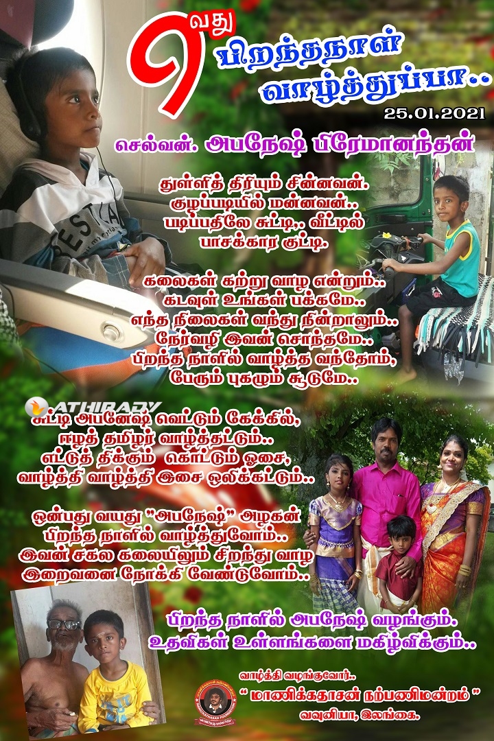 பிறந்தநாள் காணும் இருவருக்கும் அவர்களது பெற்றோர்களுக்கும் உதவிகள் பெற்றுக் கொண்டவர்கள் சார்பாக, “மாணிக்கதாசன் நற்பணி மன்றம்” வாழ்த்துக்களையும் நன்றியினையும் தெரிவித்துக் கொள்வதோடு, பிறந்தநாள் காணும் இருவருக்கும் இனிய பிறந்தநாள் வாழ்த்துக்களை தெரிவித்துக் கொள்கிறது.