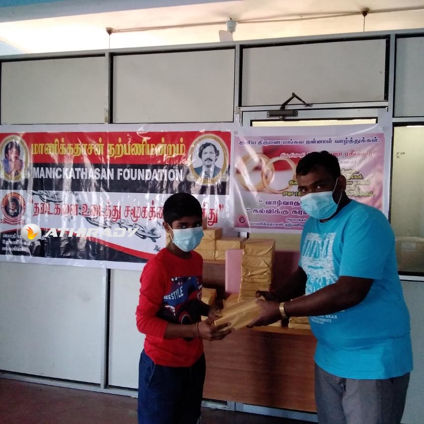 “உதயராஜா ரதீஷ்வரி தம்பதிகளின் திருமண நாளை” சிறப்பிக்கும் முகமாக மாணிக்கதாசன் நற்பணி மன்றத்திற்கு வருகை தந்த வவுனியா நகர கிராம சேவை உத்தியோகத்தர் திரு.மூத்ததம்பி கோபால் அவர்களும், வவுனியா நகர சபையின் கௌரவ உறுப்பினரும், வவுனியா வர்த்தக நலன்புரிச் சங்கத்தின் தலைவருமான லயன் திரு.ரீ.கே. இராசலிங்கம் அவர்களும், பிரபல மேடை, இணையதள அறிவிப்பாளர் திரு.ஐங்கரமுத்து யோகநாதன் (யோகா) அவர்களும், மாணிக்கதாசன் நற்பணி மன்றத்தின் தலைவர் திரு.திருக்கேஸ்வரன் சுஜீவன் அவர்களும், “மாணிக்கதாசன் நற்பணி மன்றத்தின்” பிரதம ஆலோசகர்களில் ஒருவரான கவிஞர் திரு.மாணிக்கம் ஜெகன் அவர்களும் கலந்து கொண்டு “தம்பதிகளான” திரு.திருமதி. உதயராஜா ரதீஷ்வரி அவர்களது திருமண நாளை கொண்டாடும் வகையில் அவர்களால் வழங்கப்பட்ட நிதிப்பங்களிப்பில் கற்றல் பொதிகளையும், உலருணவுப் பொதிகளையும் வழங்கி வைத்தனர்.