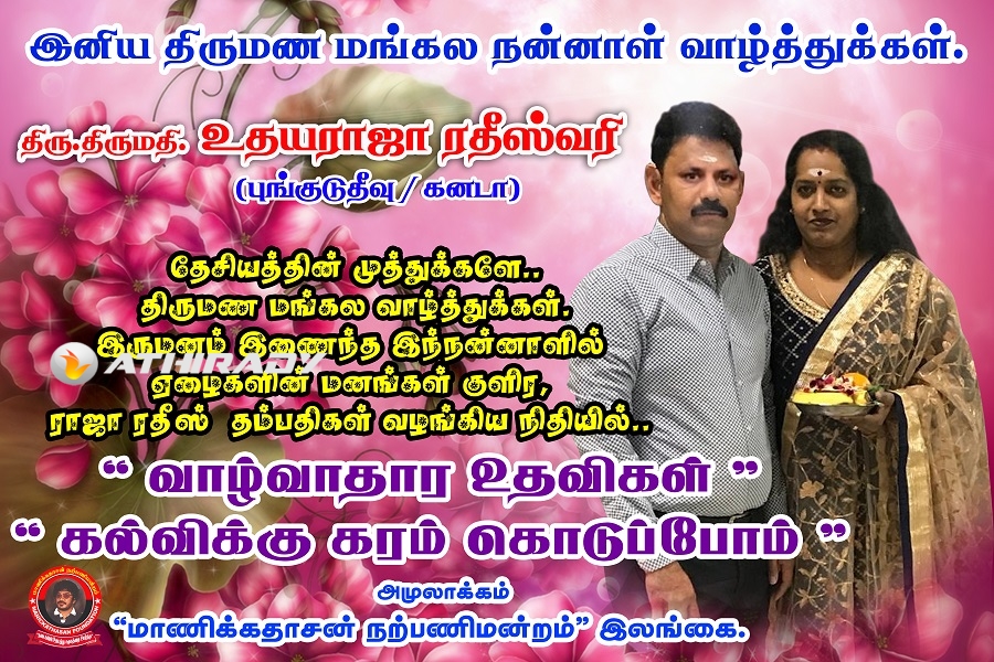 புங்குடுதீவைப் பிறப்பிடமாகக் கொண்ட, கனடாவில் வசிக்கும் புலம்பெயர் உறவுகளான திரு.திருமதி உதயராஜா ரதீஷ்வரி தம்பதிகளின் இருபத்திரெண்டாவது திருமண நாளை முன்னிட்டு, தமிழர் தாயக பிரதேசத்தில் பல்வேறு உதவிநலத் திட்டங்களை “மாணிக்கதாசன் நற்பணி மன்றத்தின்” ஊடாக அமுல்படுத்தப்பட்டு வருகிறது.