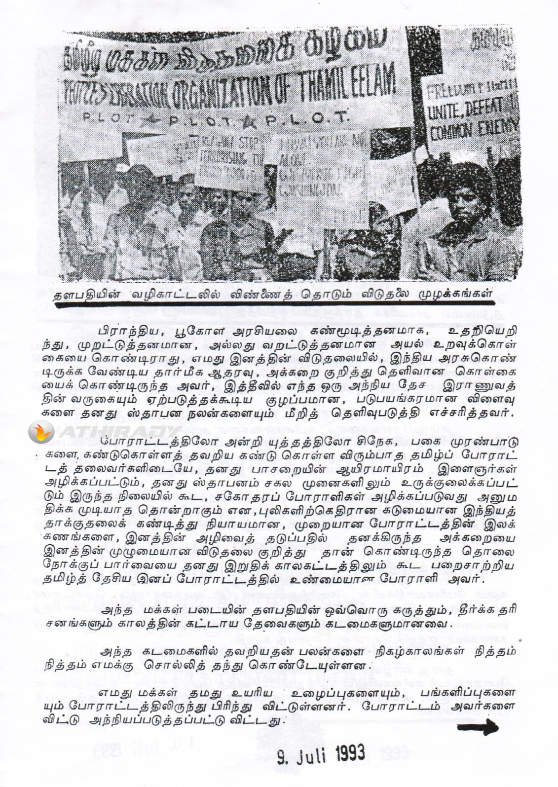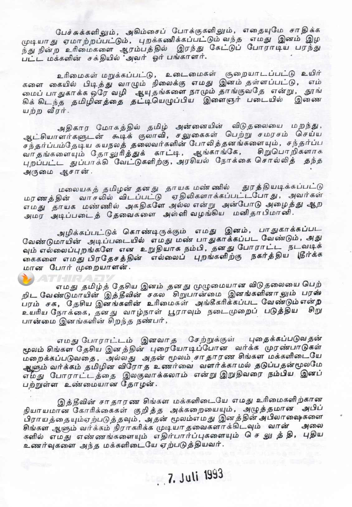 போராட்டத்திலோ அன்றி யுத்தத்திலோ சிநேக, பகை முரண்பாடுகளை கண்டுகொள்ளத் தவறிய கண்டு கொள்ள விரும்பாத தமிழ்ப் போராட்டத் தலைவர்களிடையே, தனது பாசறையின் ஆயிரமாயிரம் இளைஞர்கள் அழிக்கப்பட்டும், தனது ஸ்தாபனம் சகல முனைகளிலும் உருக்குலைக்கப்பட்டும் இருந்த நிலையில் கூட, சகோதரப் போராளிகள் அழிக்கப்படுவது அனுமதிக்க முடியாத தொன்றாகும் என, புலிகளிற்கெதிரான கடுமையான இந்தியத் தாக்குதலைக் கண்டித்து நியாயமான, முறையான போராட்டத்தின் இலக்கணங்களை, இனத்தின் அழிவைத் தடுப்பதில் தனக்கிருந்த அக்கறையை இனத்தின் முழுமையான விடுதலை குறித்து தான் கொண்டிருந்த தொலை நோக்குப் பார்வையை தனது இறுதிக் காலகட்டத்திலும் கூட பறைசாற்றிய தமிழ்த் தேசிய இனப் போராட்டத்தில் உண்மையான போராளி அவர்.