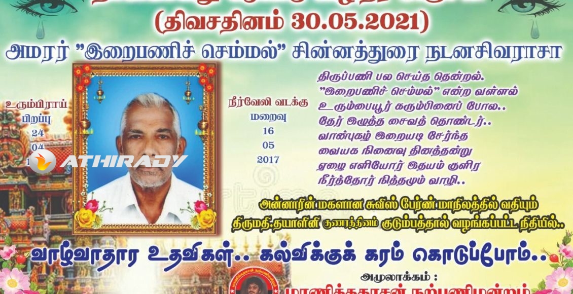 இறைபணிச் செம்மல் அமரர் நடனசிவராசா அவர்களின் திவசநாளில் நிகழ்வு.. (வீடியோ, படங்கள்) இறைபணிச் செம்மல் அமரர் நடனசிவராசா அவர்களின் திவசநாளில், அன்னாரின் மகளின் நிதி பங்களிப்பில் விசேட மதிய உணவும், வாழ்வாதார உதவிகளும் வழங்கியது மாணிக்கதாசன் நற்பணி மன்றம். ################################### காலஞ்சென்ற “இறைபணிச் செம்மல்” சின்னத்துரை நடனசிவராசா அவர்களின் நான்காமாண்டு நினைவு தினமும், சிரார்த்த திவச நாளையும் முன்னிட்டு விசேட மதிய உணவு வவுனியாவில் மிகவும் பின்தங்கிய கிராமமொன்றில் ஒழுங்கு செய்யப்பட்டு கிராம மக்களுக்கு விசேட மதிஉய … Continue reading இறைபணிச் செம்மல் அமரர் நடனசிவராசா அவர்களின் திவசநாளில் நிகழ்வு.. (வீடியோ, படங்கள்)