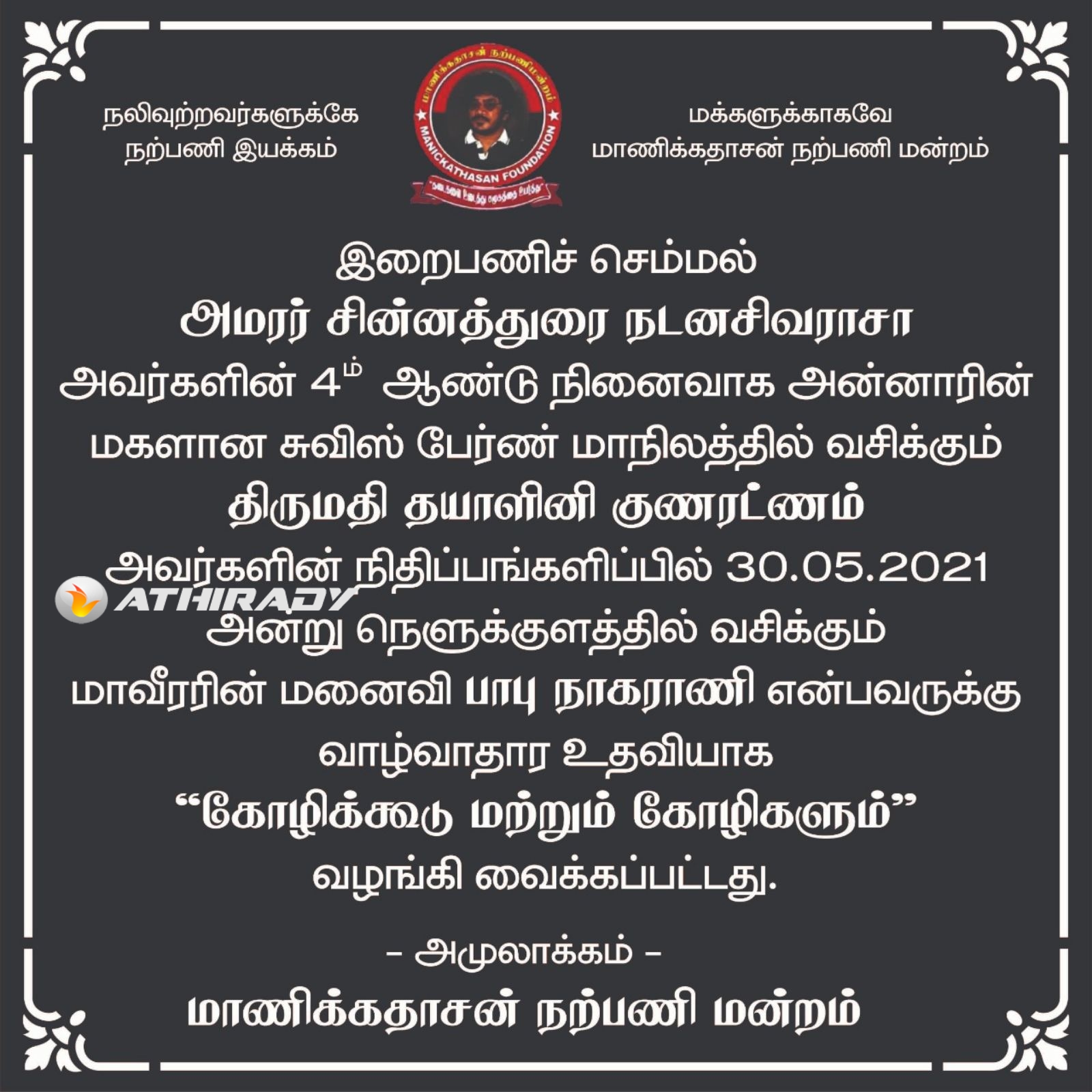 இன்றையதினம் இறுதி யுத்தத்தில் தனது கணவரையும் மூத்த மகளையும் ஒரே நாளில் செல் வீச்சுக்கு பலி கொடுத்து தற்போது இரண்டு பிள்ளைகளுடன் வீதிகளில் ஊதுபத்தி விற்பனை செய்து, அதில் வரும் சொற்ப வருமானத்தில் வவுனியா நெளுக்குளத்தில் வாடகை வீட்டில் வாழ்ந்து வரும் தாயொருவருக்கு வாழ்வாதார உதவியாக கோழிகளுடன் கோழிக்கூட்டினையும் வழங்கி வைக்கும்படி மாணிக்கதாசன் நற்பணி மன்றத்திடம் கேட்டுக் கொண்டதிற்கிணங்க பயணத்தடை, வியாபார நிலையங்கள் இயங்க முடியாத நெருக்கடியான சூழ்நிலையிலும் “மாணிக்கதாசன் நற்பணி மன்றம்” ஏற்றுக் கொண்ட பொறுப்பினை மிகக் கச்சிதமாக இன்றைய நாளில் செய்து முடித்துள்ளது.