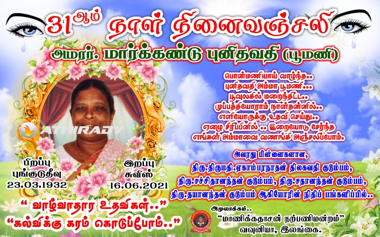 புங்குடுதீவில் பிறந்து சுவிஸில் அமரத்துவமடைந்த பூமணி என அழைக்கப்படும் அமரர் மார்க்கண்டு புனிதவதி அவர்களது முப்பத்தியோராம் நாள் தாயகத்தில் நினைவு கூறப்பட்டது.