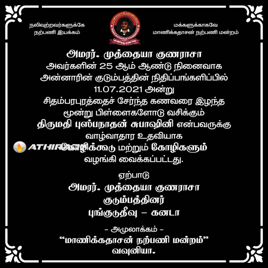 புங்குடுதீவில் பிறந்து, இலங்கை தலைநகரில் வர்த்தகத்தில் தடம்பதித்து, கனடாவில் அமரத்துவமடைந்த “குணம்” என அழைக்கப்படும் அமரர் முத்தையா குணராசா அவர்களின் 25 வது சிரார்த்த தினத்தில் அவர்களது குடும்பத்தின் நிதிப்பங்களிப்பில் கணவர் காலமான நிலையில் மூன்று குழந்தையுடன் வறிய நிலையில் வசிக்கும் சிதம்பரபுரம் கிராமத்தைச் சேர்ந்த திருமதி புஸ்பநாதன் சுபாசினி என்பவருக்கு வாழ்வாதார உதவியாக கோழிகளும், கோழிக்கூடும் இன்றைய நாளில் வழங்கி வைக்கப்பட்டது.