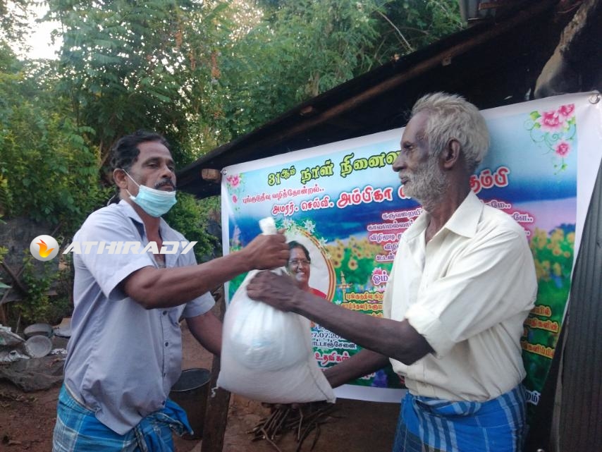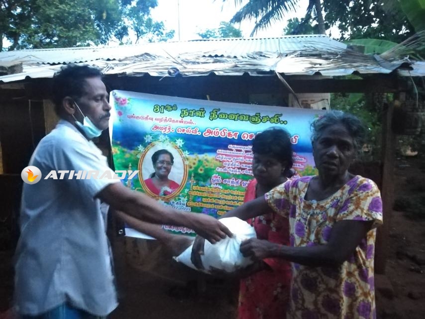 நாட்டில் கொரோனா பெருந்தொற்று காரணமாக சகல நடவடிக்கைகளும் முடக்கப்பட்ட நிலையில் வாழ்வாதாரம் பாதிக்கப்பட்ட குடும்பங்களுக்கு தமது சகோதரி அமரர் அம்பிகா அவர்களது முப்பத்தோராம் நாள் ஆத்மசாந்தி நிகழ்வை முன்னிட்டு உலருணவுப் பொதிகள் வழங்கி வைக்குமாறு சகோதரர்களின் வேண்டுகோளுக்கிணங்க அமரர் அம்பிகா அவர்களது சகோகரங்களின் நிதிப்பங்களிப்பில் மாணிக்கதாசன் நற்பணி மன்றத்தினால் வழங்கி வைக்கப்பட்டது.