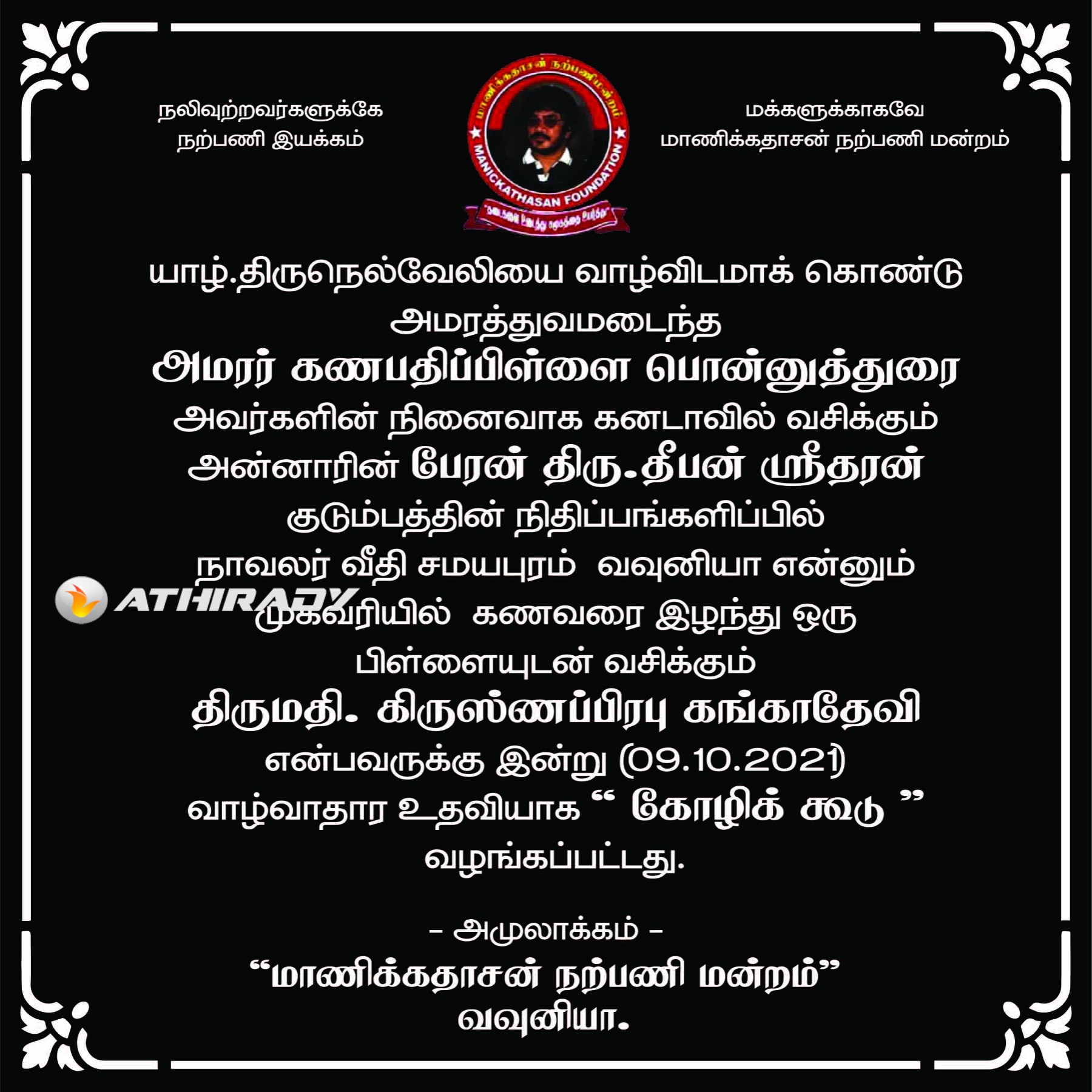 கொரோனா பெருந்தொற்று தொடர்பாக பயணத்தடை ஊரடங்கு நிலமை நாடெங்கிலும் அமுல்படுத்தப்பட்ட நேரத்தில் மாணிக்கதாசன் நற்பணி மன்றத்தினூடாக உலருணவுப் பொதிகள் வழங்கி வைக்கப்பட்ட போது சமயபுரம் நாவலர் வீதியில் வசிக்கும் கணவரை இழந்து பிள்ளைகளோடு வசிக்கும் திருமதி கிருஸ்ணப்பிரபு கங்காதேவி என்பவருக்கு இன்றைய நாளில் அமரர் கணபதிப்பிள்ளை பொன்னுத்துரை அவர்களின் நினைவாக மாணிக்கதாசன் நற்பணி மன்றத்தினால் வழங்கி வைக்கப்பட்டது.