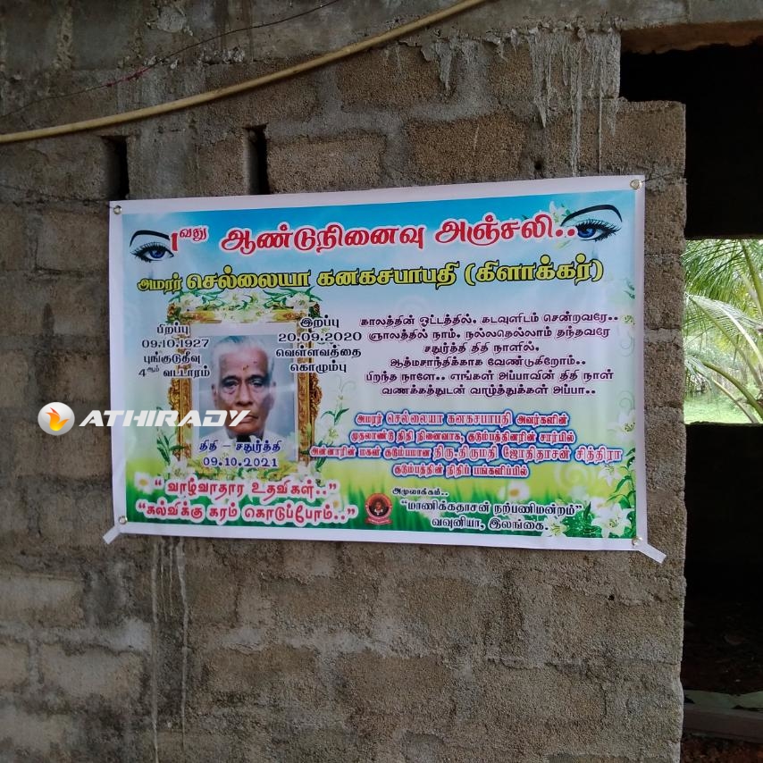 அமரத்துவமடைந்த “கிளாக்கர்” என அன்புடன் அழைக்கப்படும் செல்லையா கனகசபாபதி அவர்களின் ஆத்மாசாந்தியடைய தாயக உறவுகளோடு மாணிக்கதாசன் நற்பணி மன்றம் இறைவனை வேண்டுவதோடு, தனது தந்தையாரின் திதியினை முன்னிட்டு, தாயகத்தில் மாணிக்கதாசன் நற்பணி மன்றத்தால் ஒழுங்கு செய்யப்பட்ட ஆத்மசாந்தி நிகழ்வுக்கும் மக்களுக்கு வழங்கப்பட்ட மதிய உணவு அனைத்துக்கும் நிதிப்பங்களிப்பினை வழங்கிய அன்னாரின் மகள் ஜோதிதாசன் சித்திரா குடும்பத்தினருக்கும் தாயக சொந்தங்களோடு மாணிக்கதாசன் நற்பணி மன்றமும் தனது நன்றியினையும், வாழ்த்துக்களையும் தெரிவித்துக் கொள்கிறது.