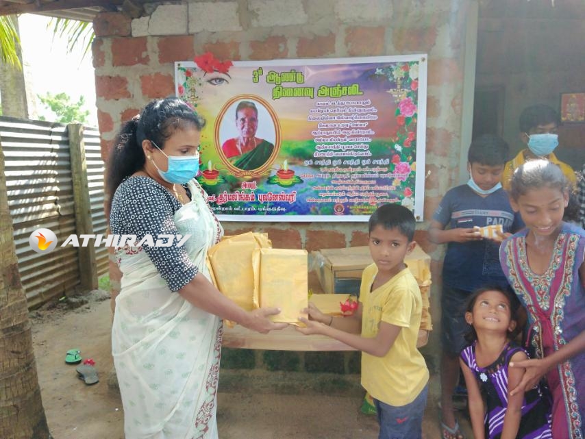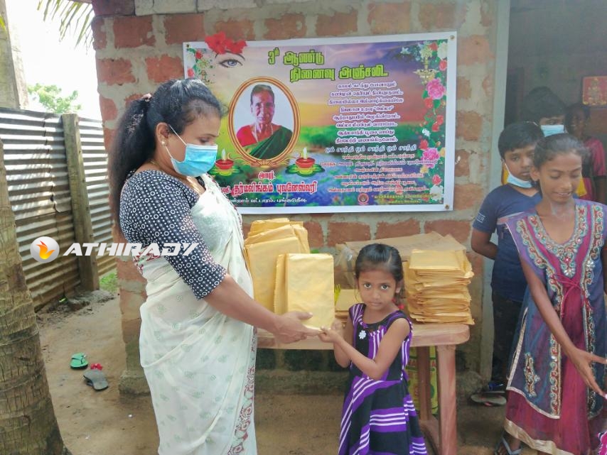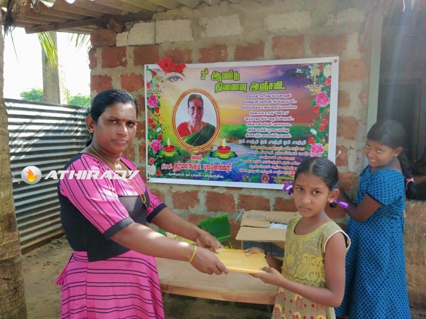 புங்குடுதீவு மூன்றாம் வட்டாரத்தைச் சேர்ந்த அமரர். திருமதி. தர்மலிங்கம் புவனேஸ்வரி அவர்களது மூன்றாமாண்டு சிராரத்ததினம் கனடாவில் வதியும் அவரது குடும்பத்தின் முழுமையான நிதிப் பங்களிப்பில், தாயக கிராமமொன்றில் விசேட ஆத்மசாந்தி பூசையுடன் மதிய உணவு வழங்கி அன்னாரது சிரார்த்தத்தை நினைவுகூர்ந்த அன்னாரின் குடும்பத்தினர், சிரார்த்த நினைவு நாளில் கலந்து கொண்ட அனைத்து பாடசாலை மாணவர்களுக்கும் கற்றல் உபகரணங்களையும் வழங்கி அனுஸ்டித்தனர்.