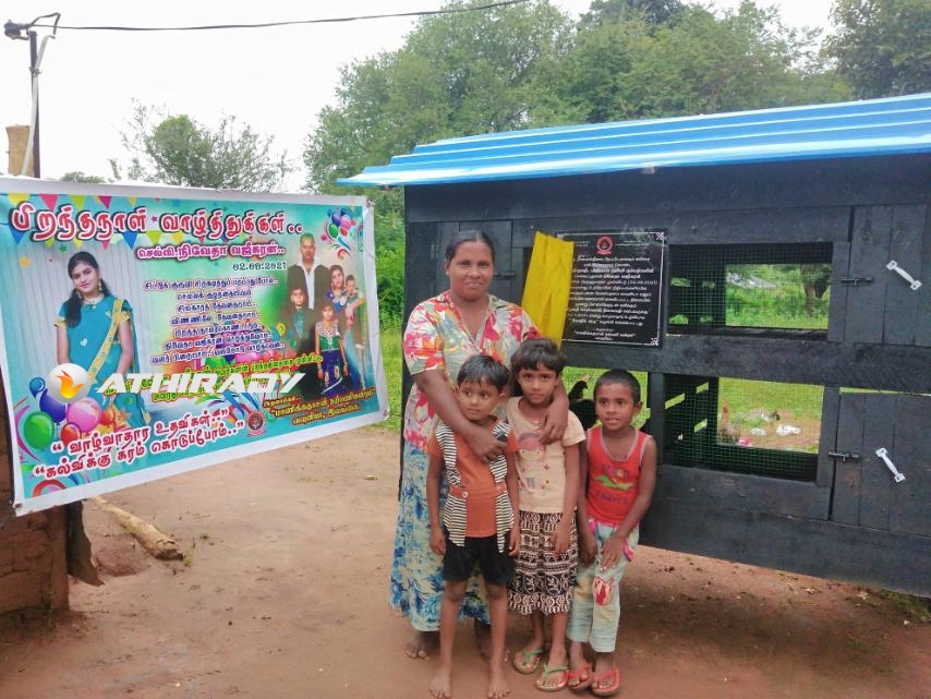 அதேநேரம் தங்களின் மகளான நிவேதா அவர்களின் பிறந்த நாளை முன்னிட்டு வறிய நிலையில் வாழும தாயக உறவுகளை இனங்கண்டு அவர்களுக்கு வாழ்வாதார உதவியாக கோழிக்கூட்டினை வழங்கி வைக்கும்படி திரு.திருமதி வஜீகரன் நளினி தம்பதிகள் “மாணிக்கதாசன் நற்பசி மன்றத்திடம்” கேட்டுக் கொண்டதற்கிணங்க இன்றைய நாளில் சின்னத்தம்பனை வேலன்குளத்தினைச் சேர்ந்த மிகமிக வறுமையிள்ள மூன்று சிறு பிள்ளைகளைக் கொண்ட பெண் தலமைத்துவ குடும்பத்திற்கு, வாழ்வாதார உதவியாக கோழிக்கூடு வழங்கி வைக்கப்பட்டது.