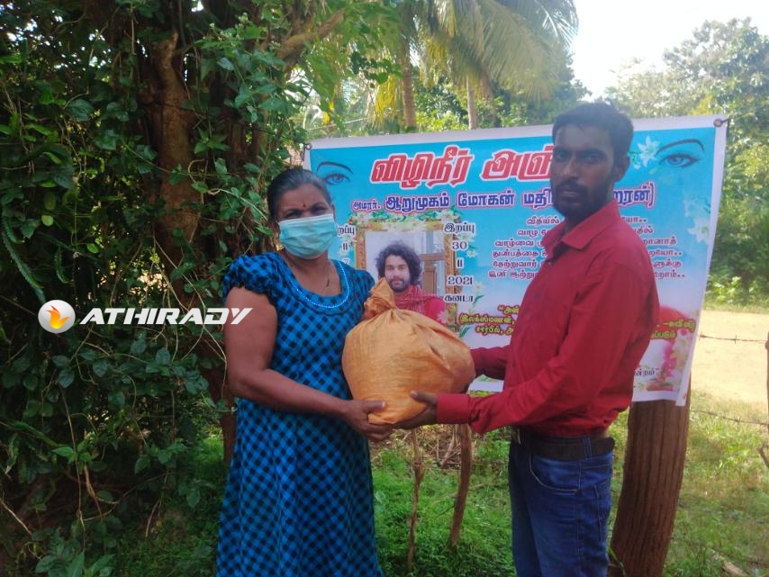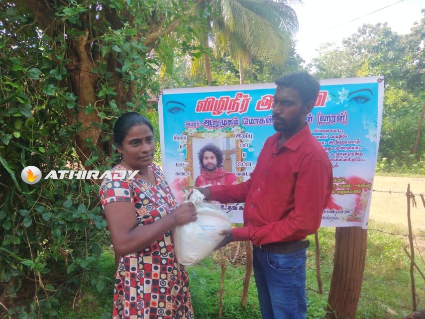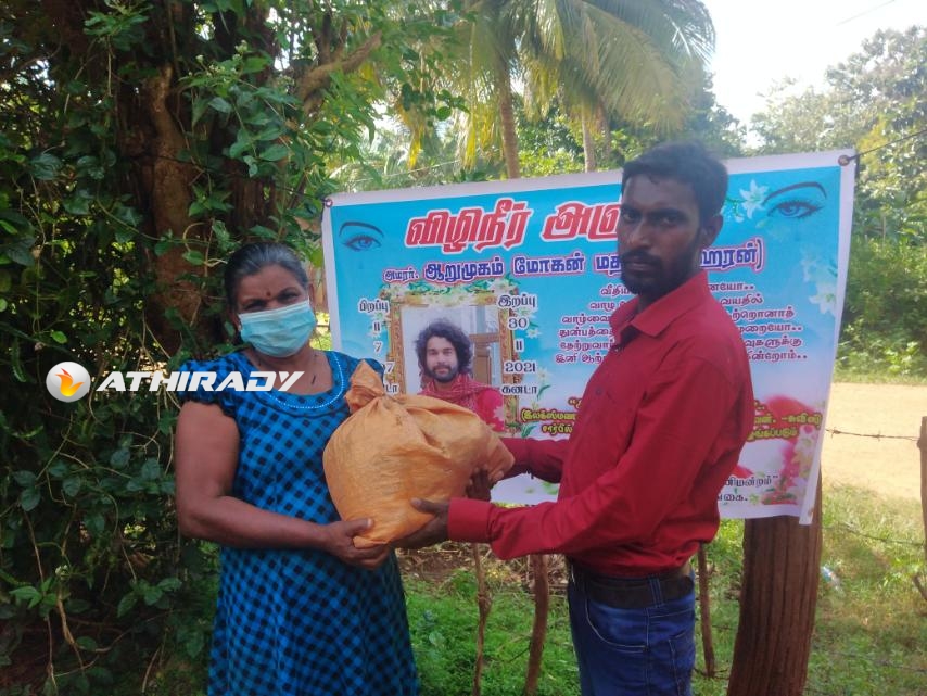 கனடாவில் பிறந்து கனடாவிலே வீதியில் ஏற்பட்ட வாகன விபத்தில் மரணித்த ஹரன் என செல்லமாக அழைக்கப்படும்ஆறுமுகம் மோகன் மதிகரன் அவர்களின் இறுதிப் பயணத்தில், “அன்னாரின் ஆத்மா சாந்தியடைய வேண்டி” தாயக உறவுகளின் பசியினைப் போக்கிய, சுவிஸ் லுக்ஸ் அண்ணன் என அழைக்கப்படும் திரு.இலக்ஸ்மணன் அவர்களின் மகனும், அமரர்.ஹரனின் உடன்பிறவா சகோதரனுமாகிய திரு.லவன், தனது நிதிப்பங்களிப்பில் தாயக உறவுகளுக்கு வாழ்வாதார உதவியாக உலருணவுப் பொதிகளை அமரத்துவமடைந்த ஹரனின் இறுதி நிகழ்வு கனடா தேசத்தில் நடைபெறும் சமயத்தில், தாயக உறவுகளுக்கு மாணிக்கதாசன் நற்பணி மன்றத்திள் ஊடாக வழங்கி வைத்தார்.