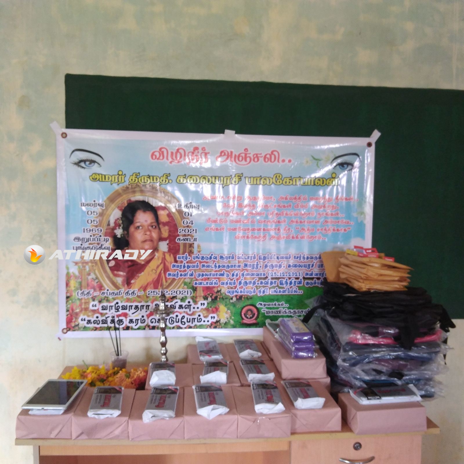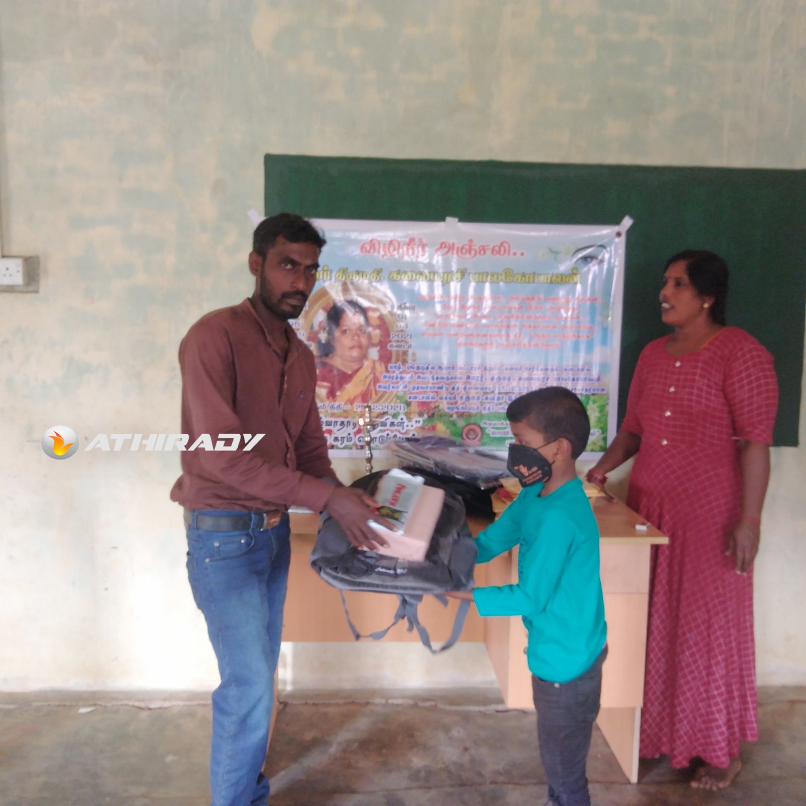 யாழ். புங்குடுதீவு ஆறாம் வட்டாரம் இறுப்பிட்டியைச் சேர்ந்தவரும், கனடாவில் அமரத்துவம் அடைந்தவருமான அமரர். திருமதி. கலையரசி பாலகோபாலன் அவர்களின் முதலாமாண்டு திதி எதிர்வரும் 25.12.2021 அன்றாகும் அதனை முன்னிட்டு அன்னாரின் நினைவாக அமரர் திருமதி கலையரசி பாலகோபாலன் அவர்களது சகோதரியான கனடாவில் வதியும் திருமதி.கவிதா இந்திரன் குடும்பத்தால் வழங்கப்பட்ட நிதிப் பங்களிப்பில்.. வவுனியா நெளுக்குளம் பாலாமைக்கல் எனும் மிகவும் பின்தங்கிய கிராமத்தில் தேர்ந்தெடுக்கப்பட்ட விசேட தேவைக்கு உட்பட்ட, மற்றும் வறுமைக் கோட்டுக்கு கீழே வாழும், மற்றும் பெற்றோர் இல்லாத மாணவ மாணவிகளில் ஒரு தொகையினருக்கு, அடுத்த வருடத்துக்கான தேவையான முழுமையான “கற்றல் உபகரணங்கள்” அடங்கிய பொதி வழங்கி வைக்கப்பட்டது.