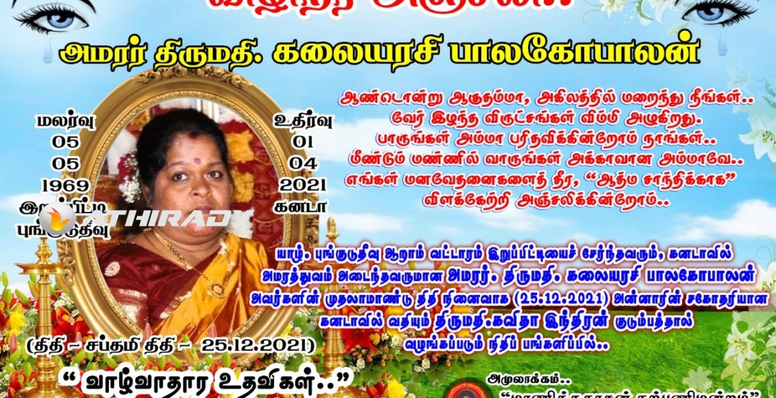 கனடா அமரர் திருமதி கலையரசி நினைவாக, தாயக உறவுகளுக்கு கற்றல் உபகரணங்கள் வழங்கி வைப்பு.. (படங்கள், வீடியோ) ###################################### யாழ். புங்குடுதீவு ஆறாம் வட்டாரம் இறுப்பிட்டியைச் சேர்ந்தவரும், கனடாவில் அமரத்துவம் அடைந்தவருமான அமரர். திருமதி. கலையரசி பாலகோபாலன் அவர்களின் முதலாமாண்டு திதி எதிர்வரும் 25.12.2021 அன்றாகும் அதனை முன்னிட்டு அன்னாரின் நினைவாக அமரர் திருமதி கலையரசி பாலகோபாலன் அவர்களது சகோதரியான கனடாவில் வதியும் திருமதி.கவிதா இந்திரன் குடும்பத்தால் வழங்கப்பட்ட நிதிப் பங்களிப்பில்.. வவுனியா நெளுக்குளம் பாலாமைக்கல் எனும் … Continue reading கனடா அமரர் திருமதி கலையரசி நினைவாக, தாயக உறவுகளுக்கு கற்றல் உபகரணங்கள் வழங்கி வைப்பு.. (படங்கள், வீடியோ)