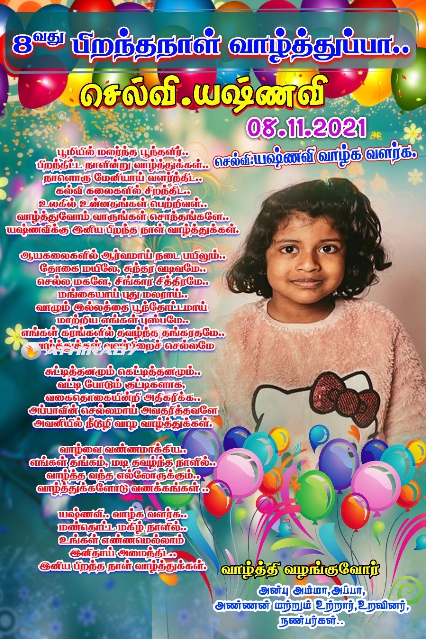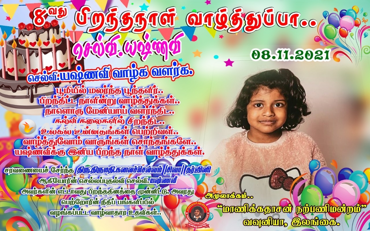 இதேவேளை பிறந்த நாளைக் கொண்டாடும் செல்வி யஸ்ணவிக்கு தாயக உறவுகளோடு மாணிக்கதாசன் நற்பணி மன்றமும் நல்வாழ்த்தினையும் மகிழ்ச்சினையும் தெரிவித்துக் கொள்ளும் அதேவேளை, இவற்றுக்கான நிதிப்பங்களிப்பினை வழங்கிய செல்வி. யஸ்ணவியின் பெற்றோர்களுக்கும் தாயக சொந்தங்களோடு இணைந்து மாணிக்கதாசன் நற்பனி மன்றம் தனது நல்வாழ்த்துக்களை தெரிவித்துக் கொள்கிறது.