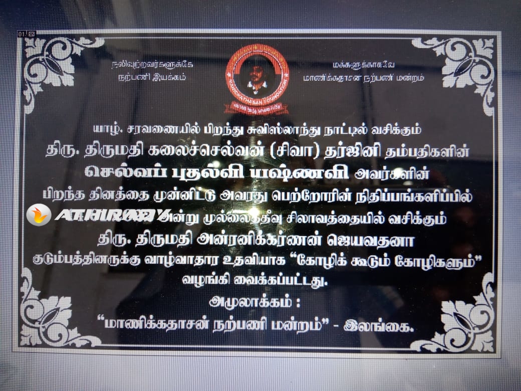 இதனைத் தொடர்ந்து இன்றையதினமான தைப்பொங்கல் மற்றும் அமரர்.மாணிக்கதாசன் அவர்களின் பிறந்த தினமாகிய இன்று, செல்வி.யஸ்ணவியின் பிறந்தநாளை முன்னிட்டு அவரது பெற்றோரின் முழுமையான நிதிப் பங்களிப்பில் முல்லைத்தீவு சிலாவத்தையில் வசிக்கும் திரு.திருமதி அன்ரனிக்கர்ணன் ஜெயவதனா குடும்பத்தினருக்கு வாழ்வாதார உதவியாக “கோழிக்கூடும், கோழிகளும்” வழங்கி வைக்கப்பட்டது.