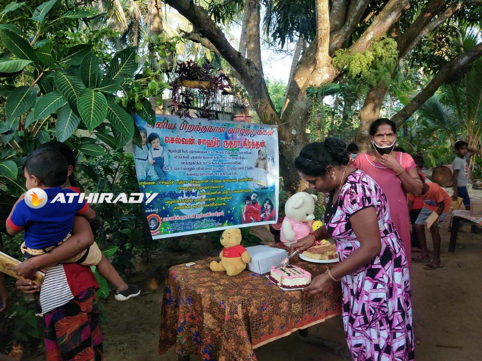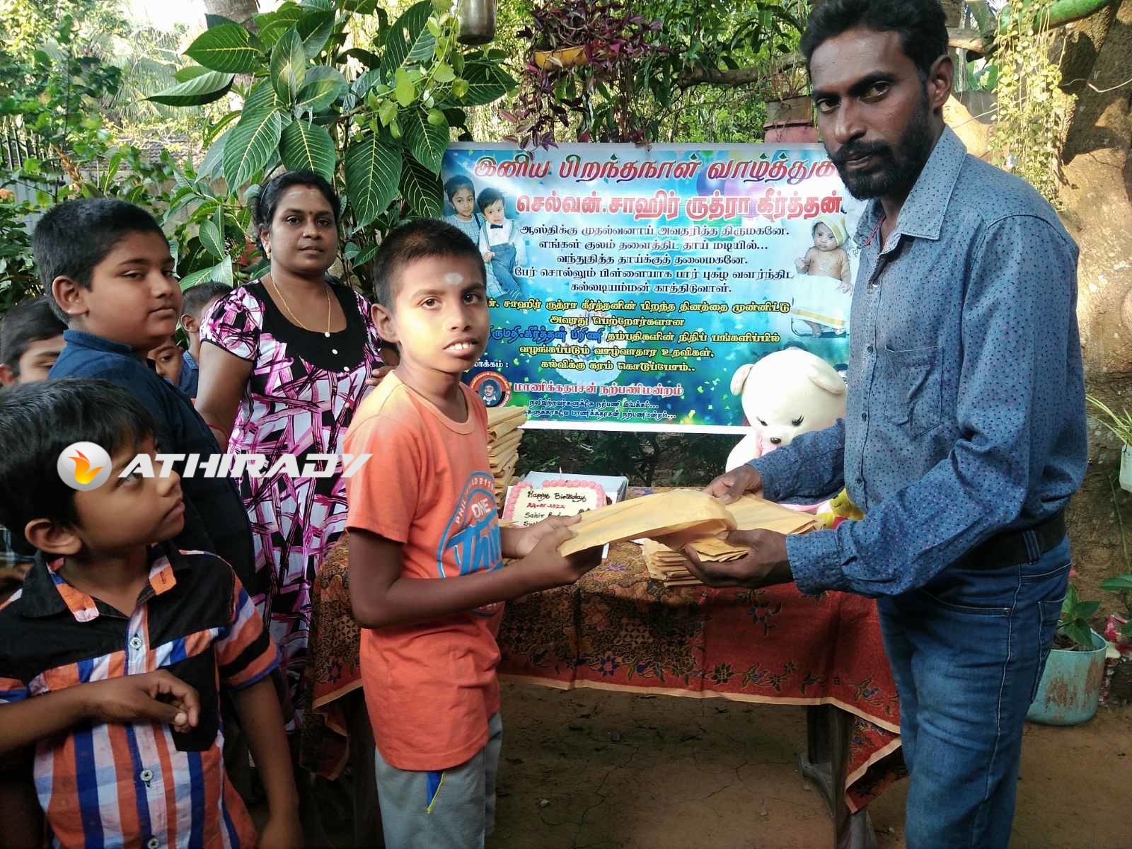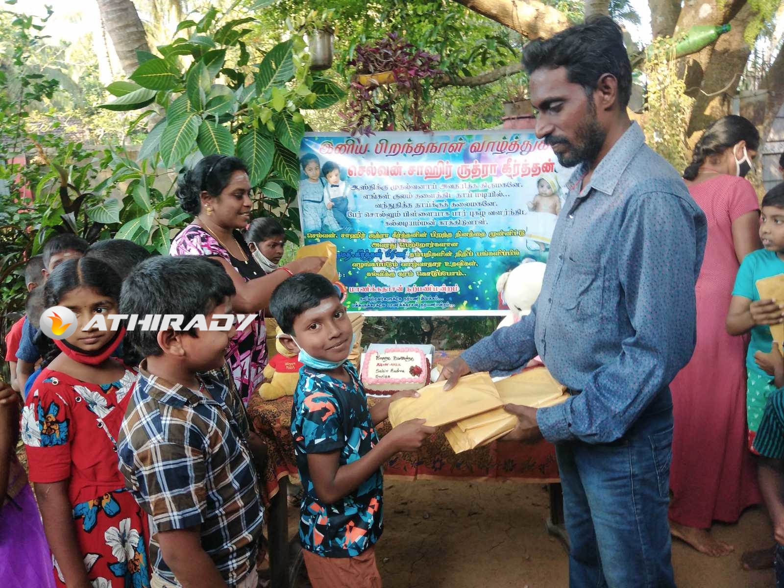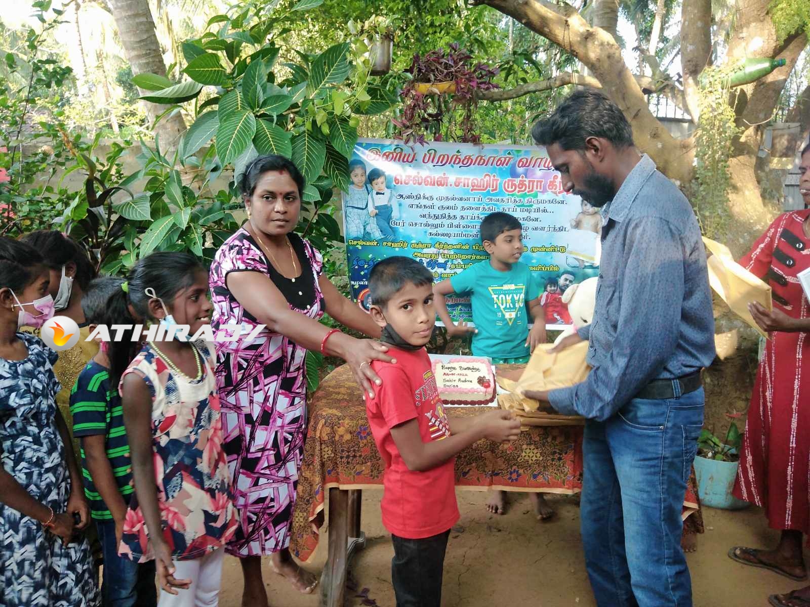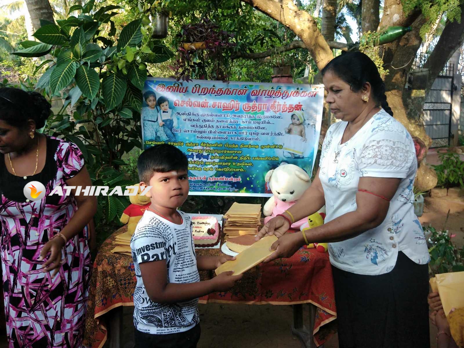 சுவிஸ் நாட்டில் வசிக்கும் திரு.திருமதி கீர்த்தன் பிரிணி தம்பதிகளின் செல்வப் புதல்வன் சாஹீர் ருத்ரா அவர்களது முதலாவது பிறந்த நாள் கொண்டாட்டம்.மாணிக்கதாசன் நற்பணி மன்றத்தின் ஓழுங்கமைப்பில் தாயக கிராம்மொன்றில் மிக விமர்சையாக கொண்டாடப்பட்டது. இந்நிகழ்வில் பொருந்தொகையான மாணவ மாணவிகள் தங்களின் பெற்றோர்களோடு வந்திருந்து பிறந்த நாளை சிறப்பித்தனர்.
