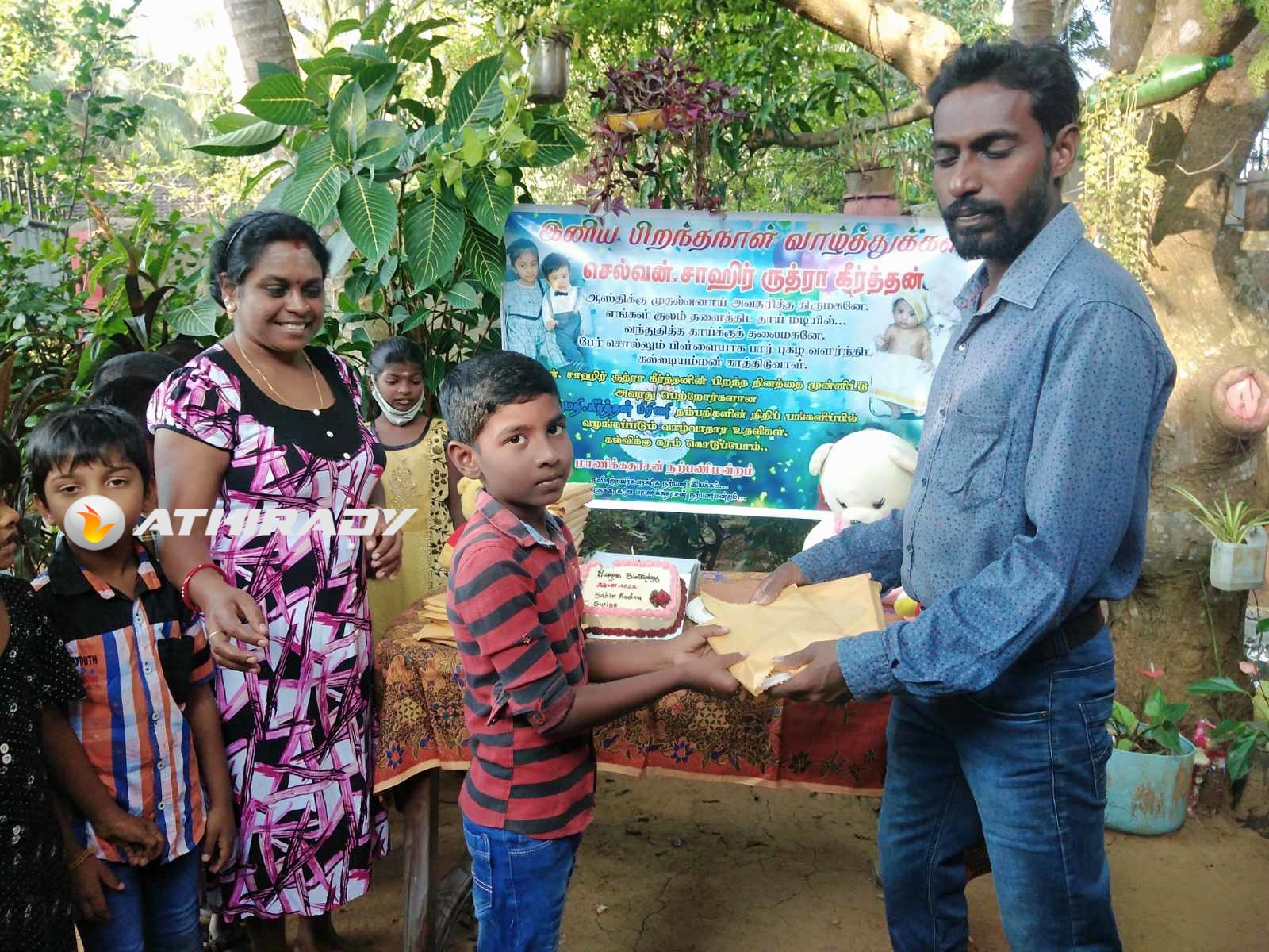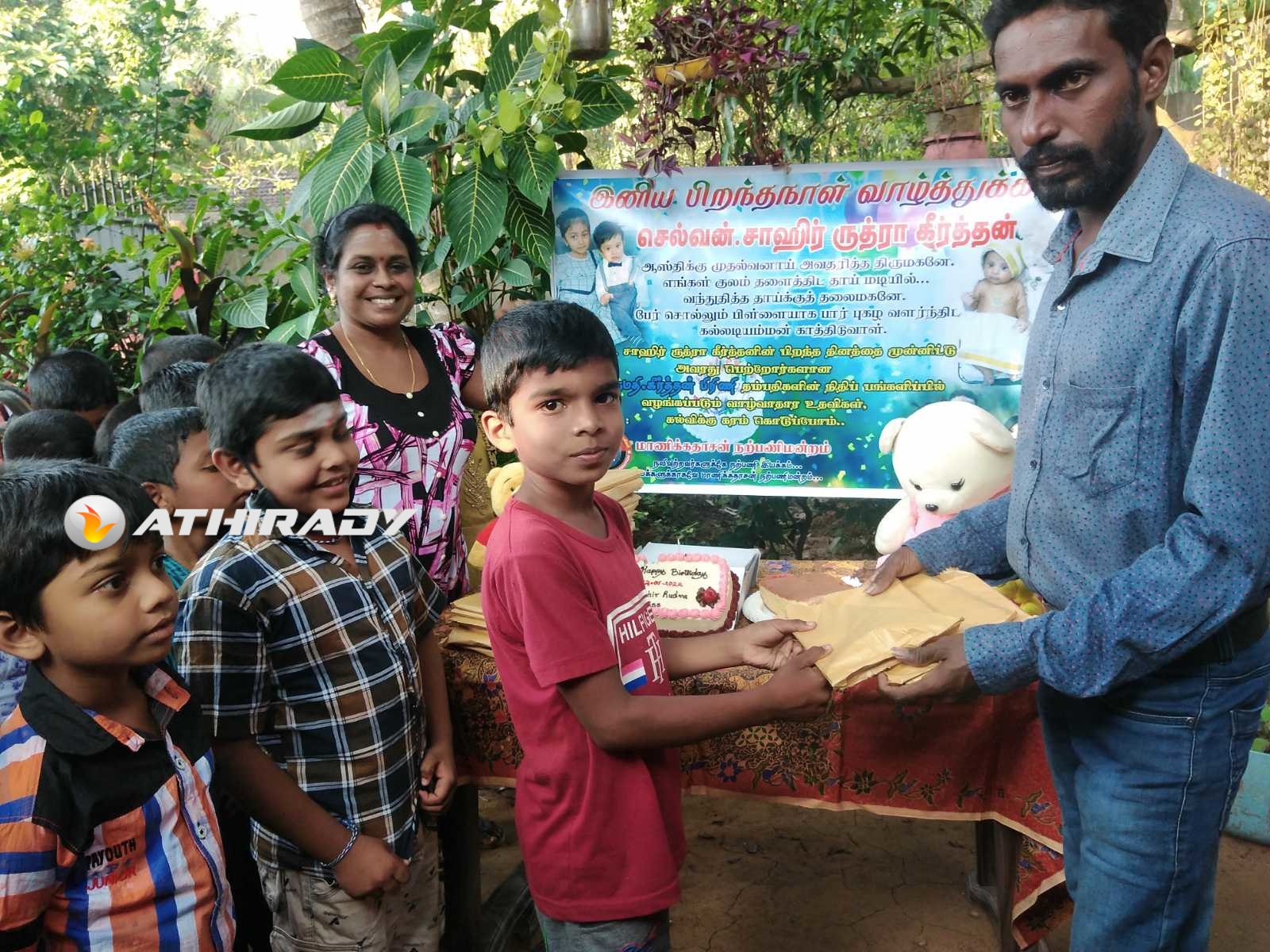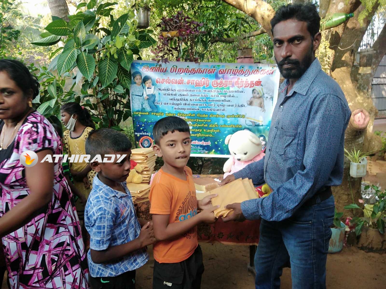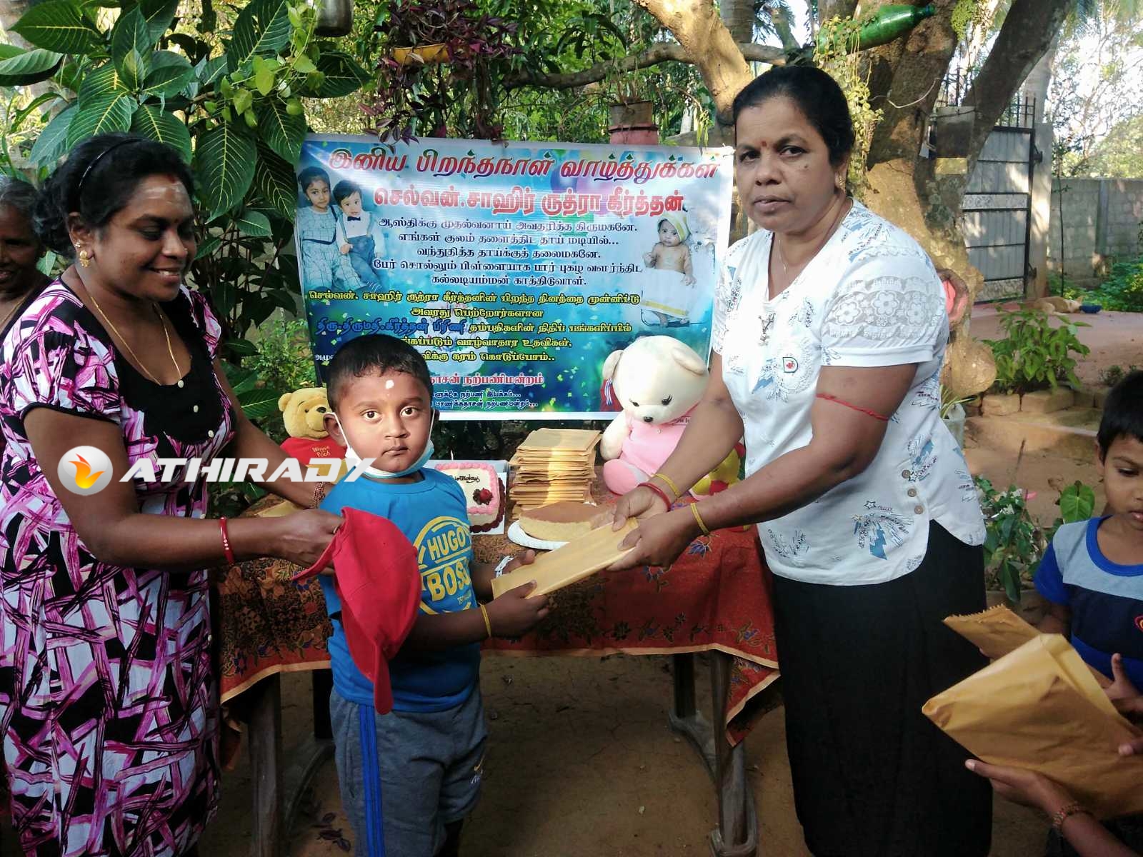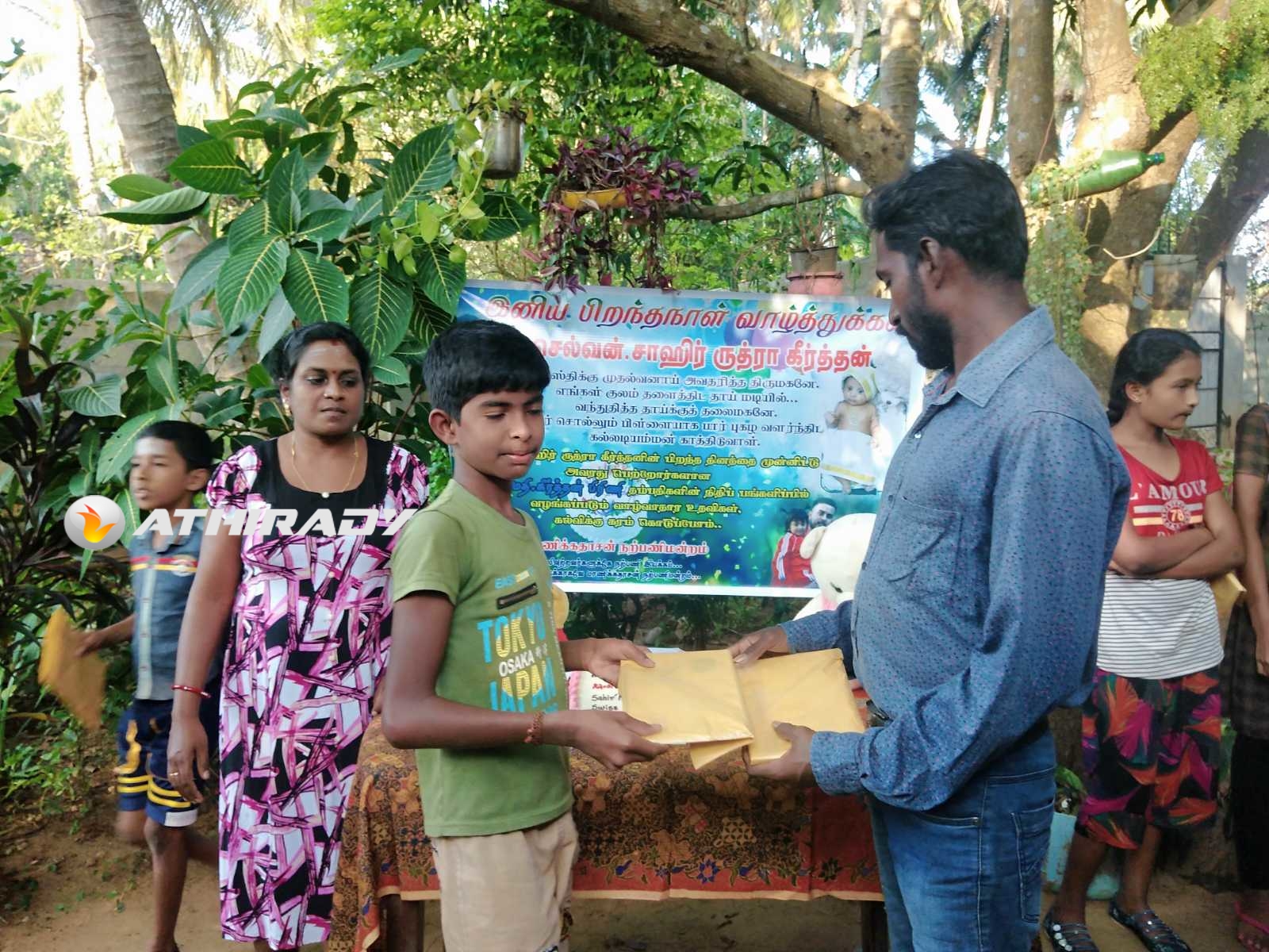 சுவிஸ் நாட்டில் வசிக்கும் திரு.திருமதி கீர்த்தன் பிரிணி தம்பதிகளின் செல்வப் புதல்வன் சாஹீர் ருத்ரா அவர்களது முதலாவது பிறந்த நாள் கொண்டாட்டம்.மாணிக்கதாசன் நற்பணி மன்றத்தின் ஓழுங்கமைப்பில் தாயக கிராம்மொன்றில் மிக விமர்சையாக கொண்டாடப்பட்டது. இந்நிகழ்வில் பொருந்தொகையான மாணவ மாணவிகள் தங்களின் பெற்றோர்களோடு வந்திருந்து பிறந்த நாளை சிறப்பித்தனர்.