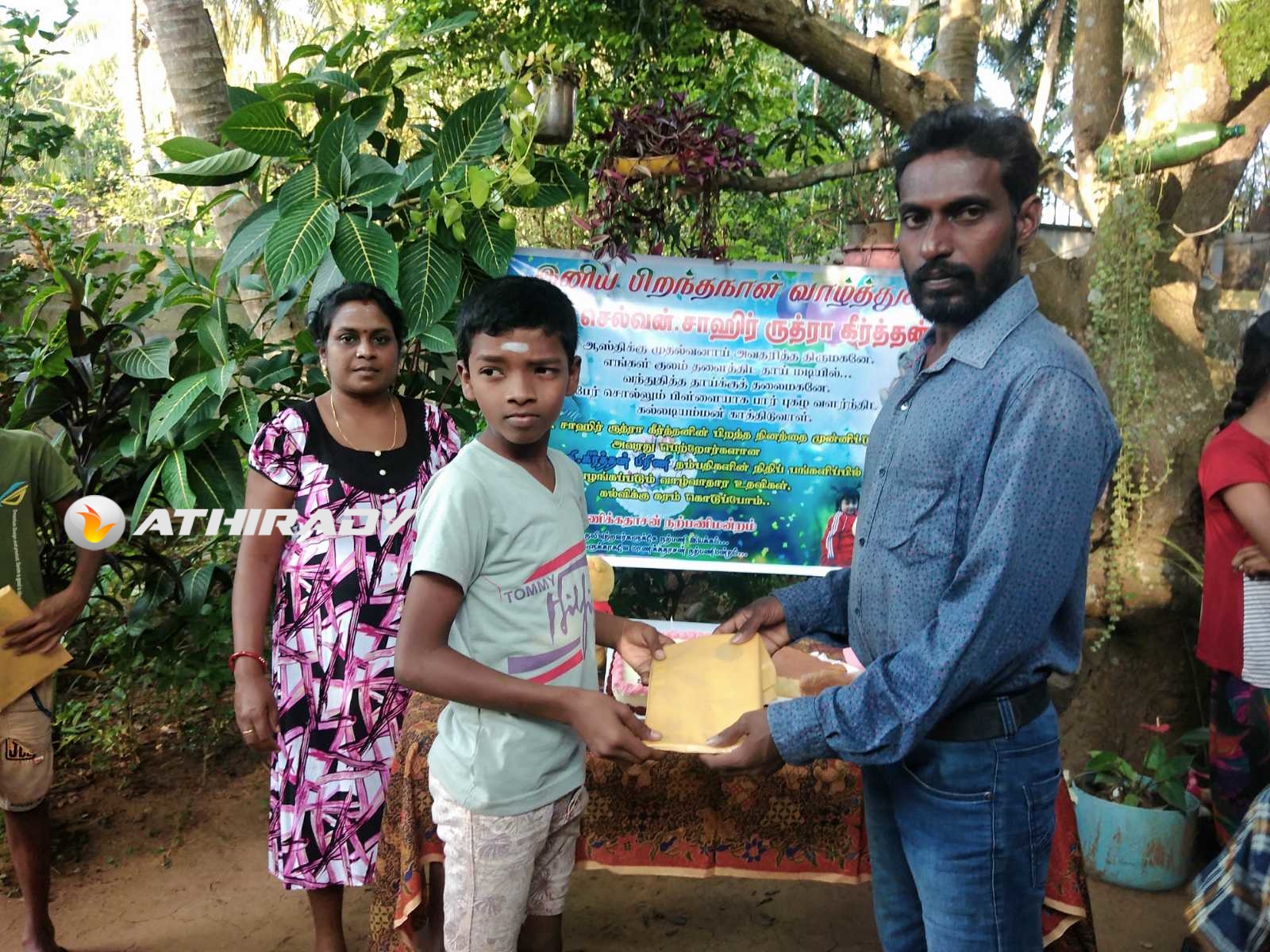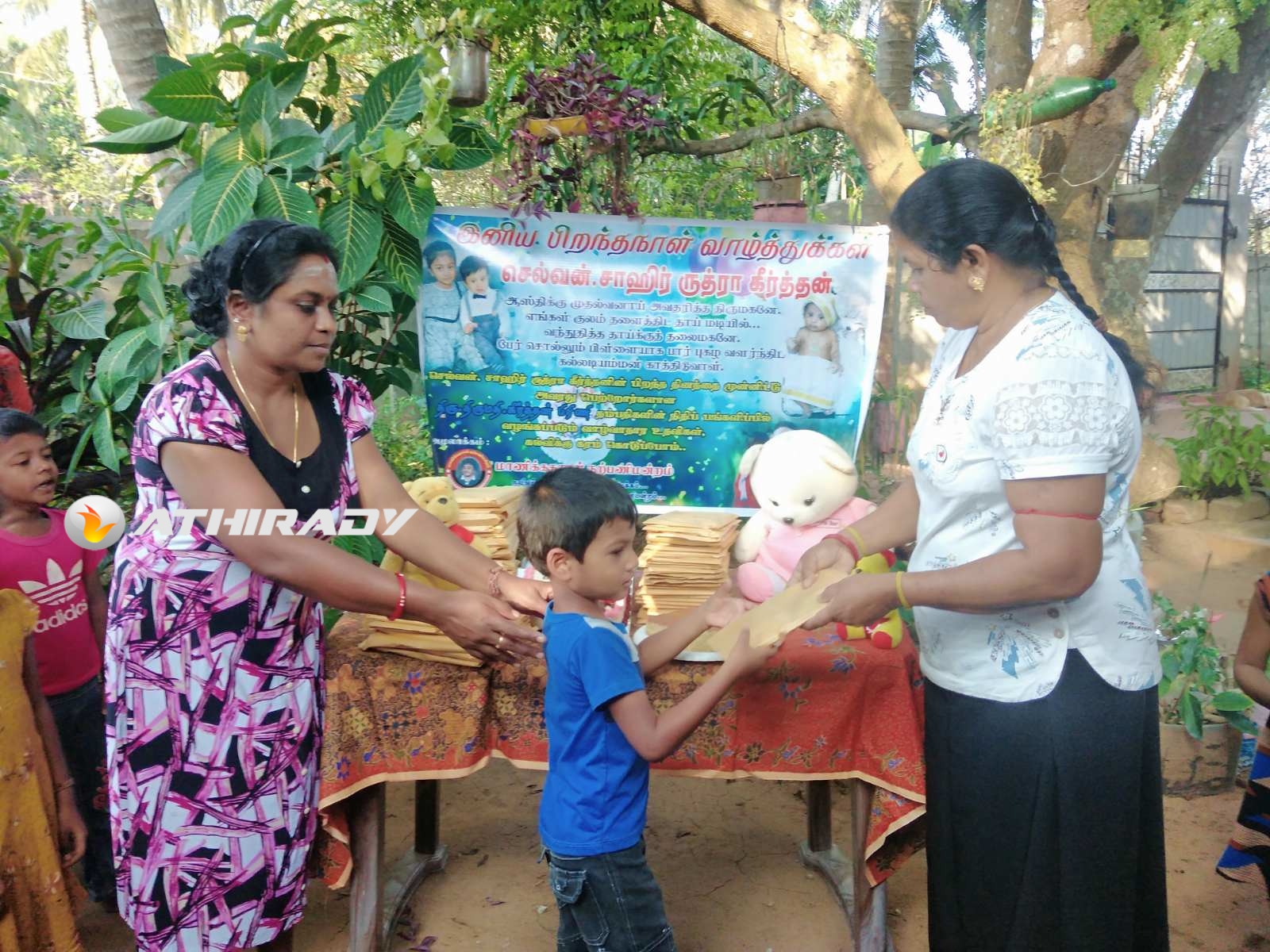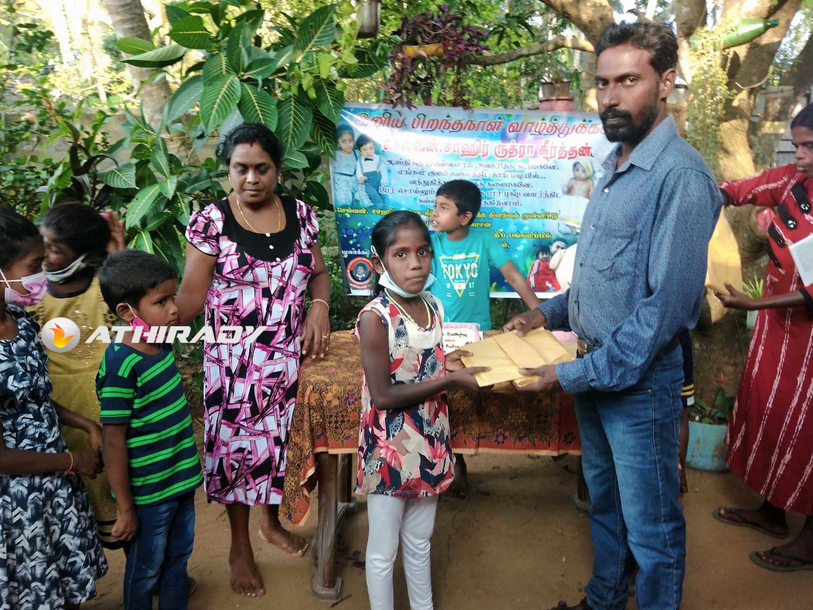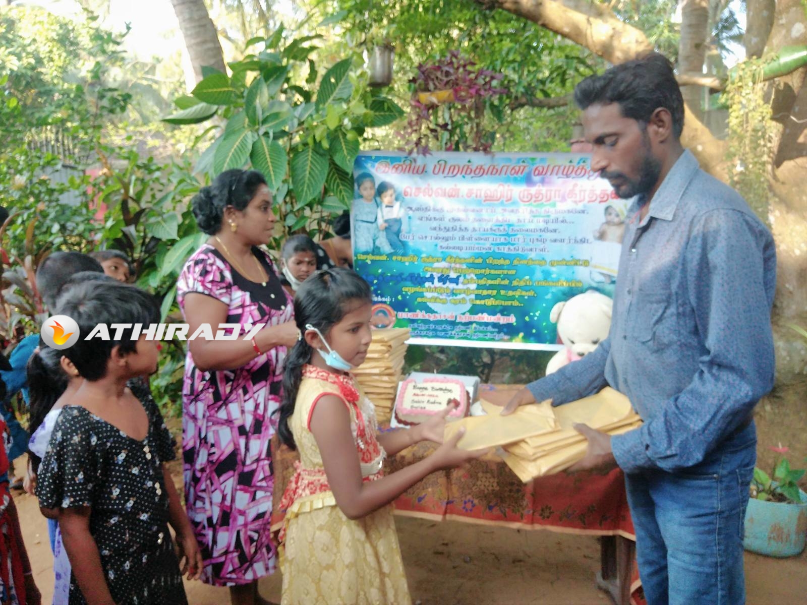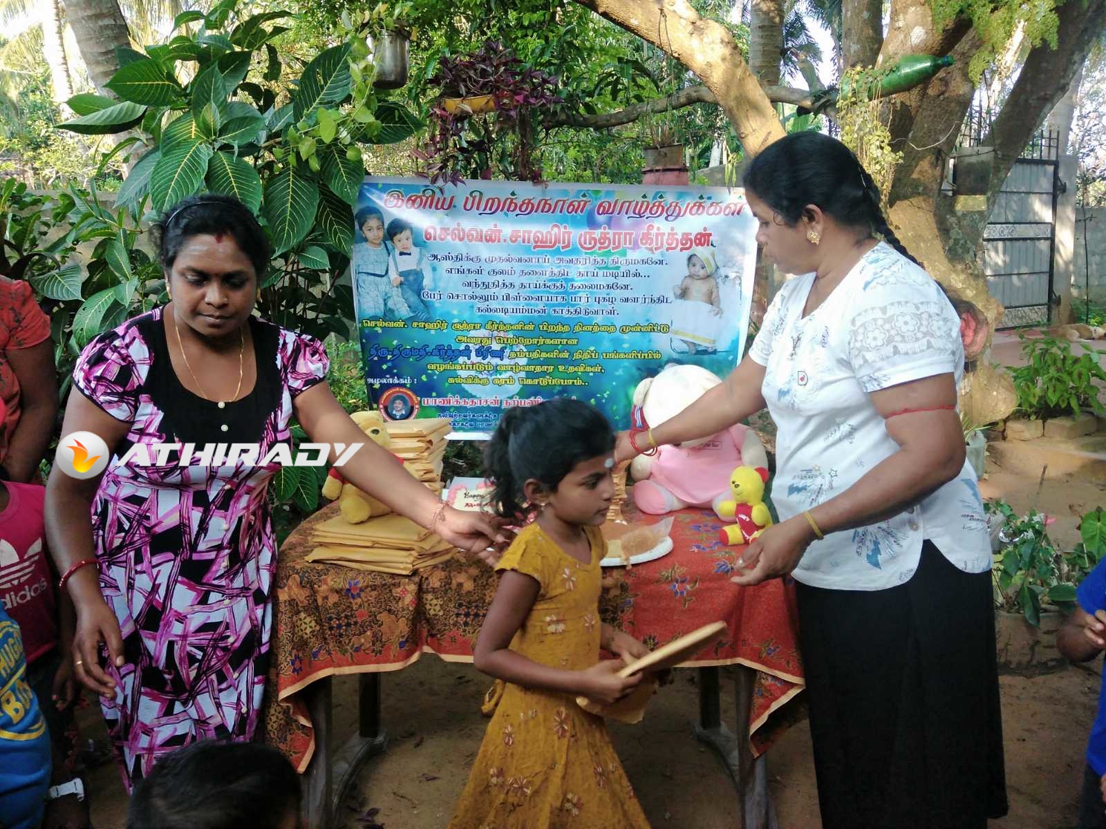 சுவிஸ் நாட்டில் வசிக்கும் திரு.திருமதி கீர்த்தன் பிரிணி தம்பதிகளின் செல்வப் புதல்வன் சாஹீர் ருத்ரா அவர்களது முதலாவது பிறந்த நாள் கொண்டாட்டம்.மாணிக்கதாசன் நற்பணி மன்றத்தின் ஓழுங்கமைப்பில் தாயக கிராம்மொன்றில் மிக விமர்சையாக கொண்டாடப்பட்டது. இந்நிகழ்வில் பொருந்தொகையான மாணவ மாணவிகள் தங்களின் பெற்றோர்களோடு வந்திருந்து பிறந்த நாளை சிறப்பித்தனர்.