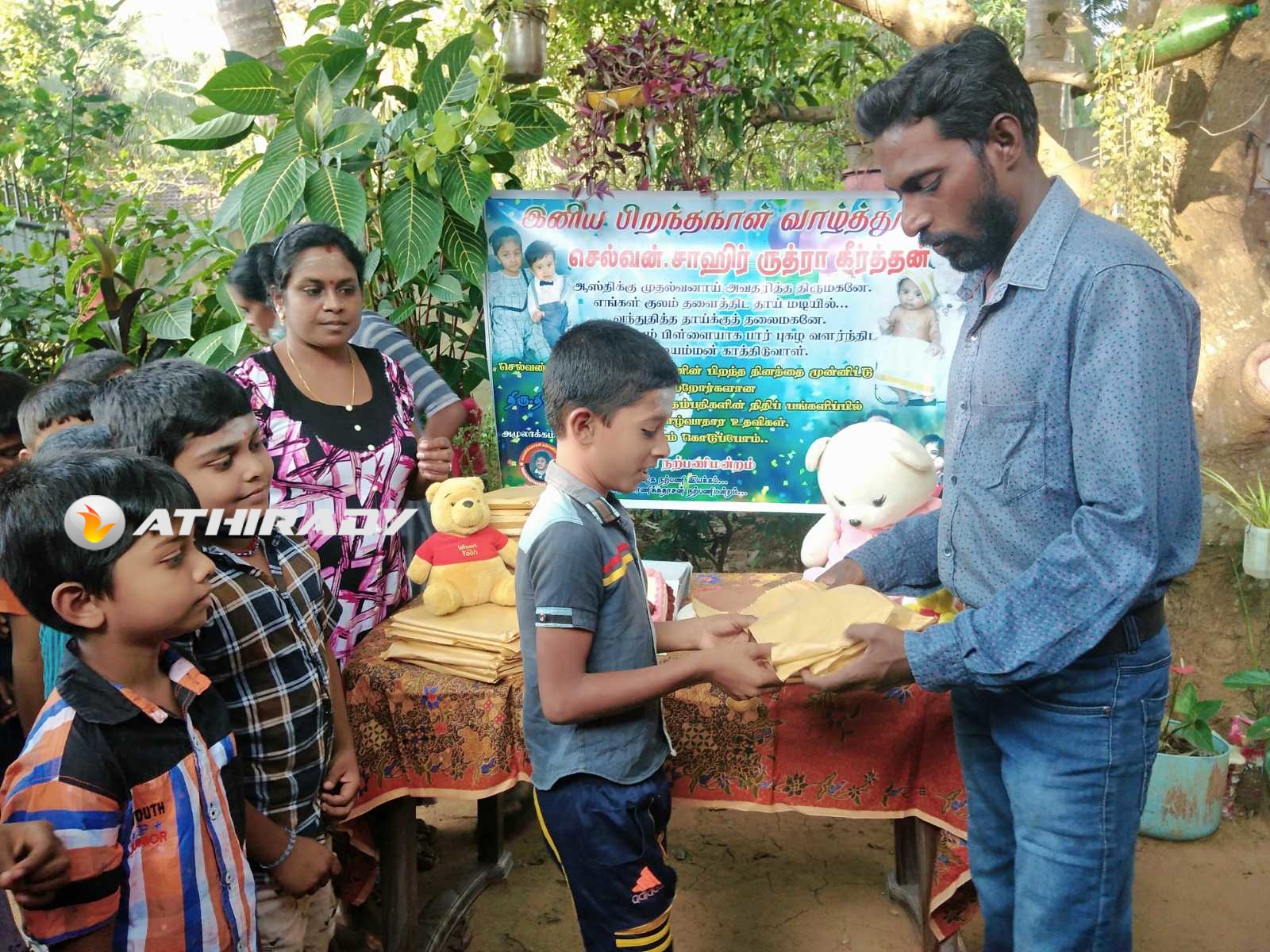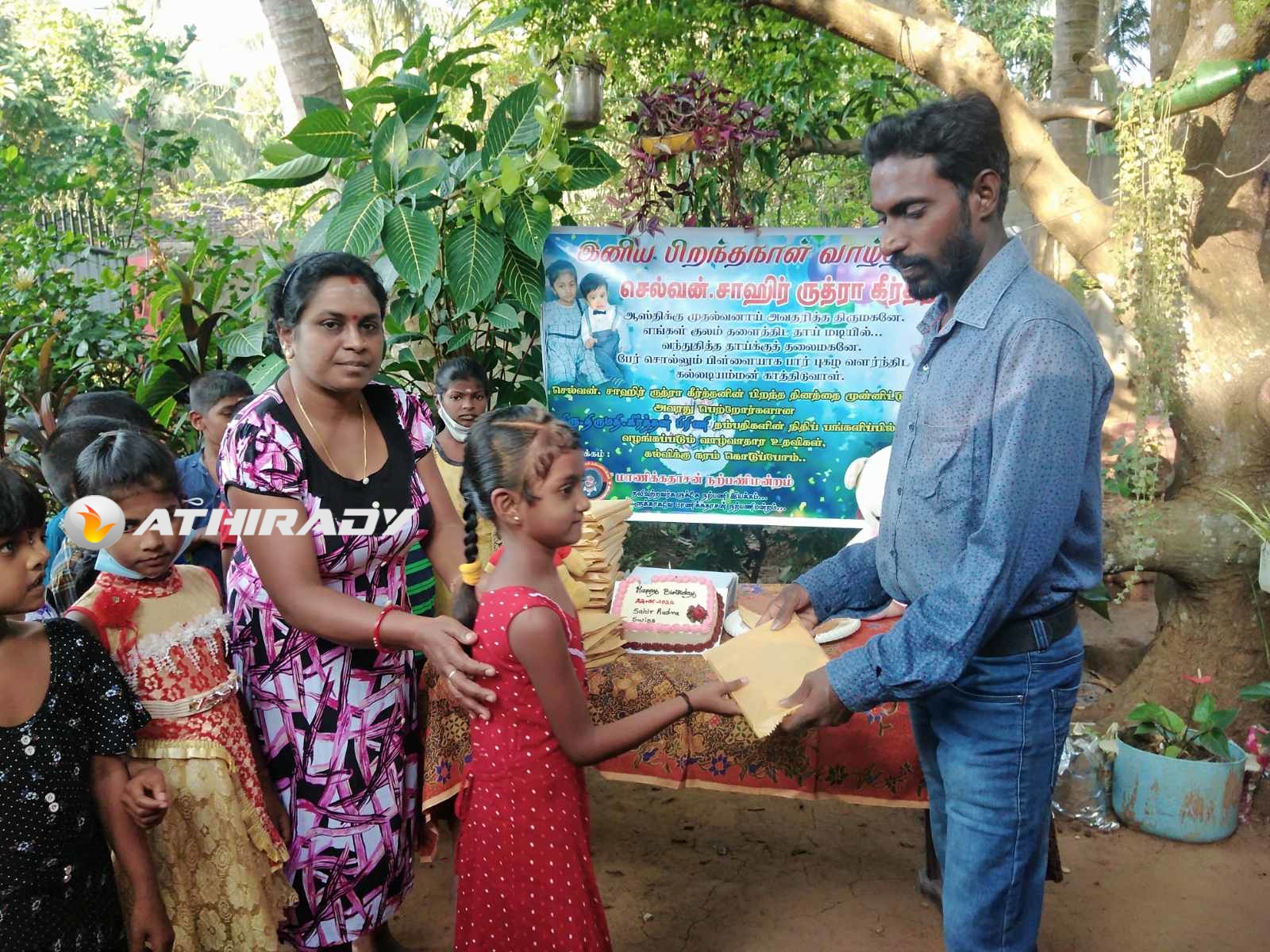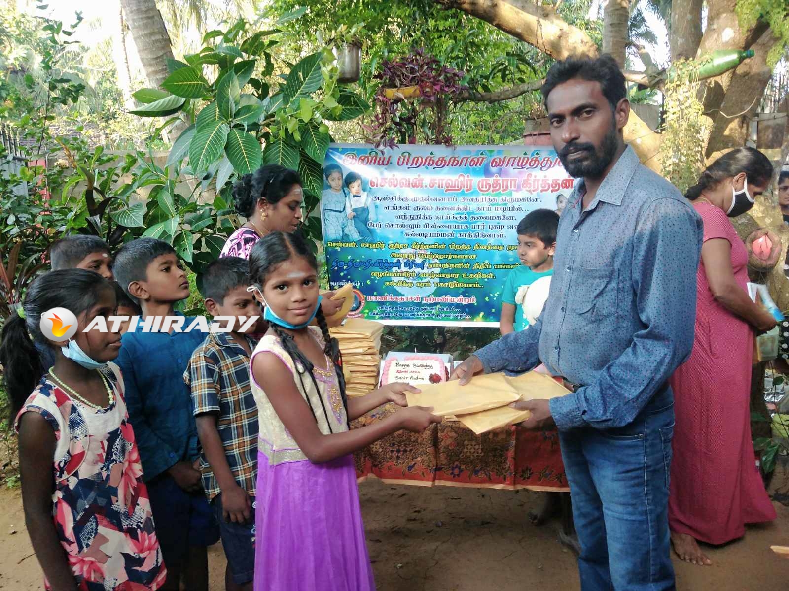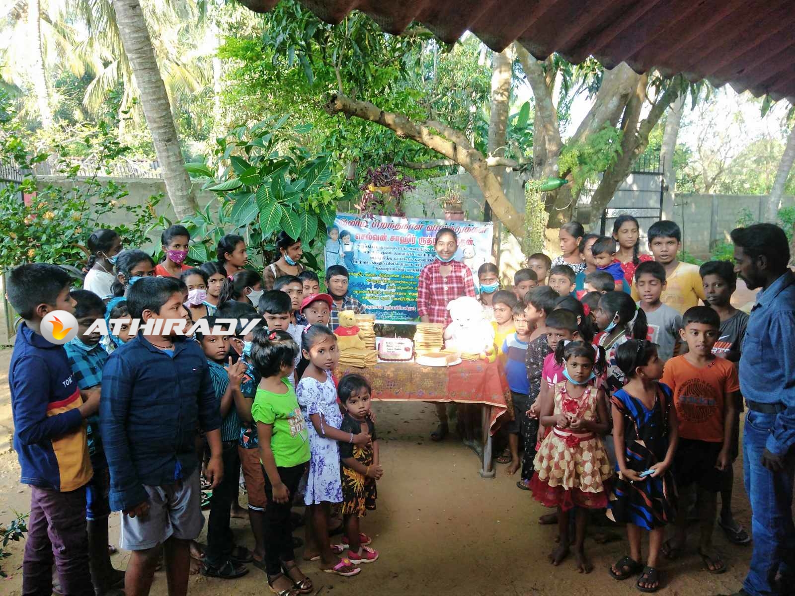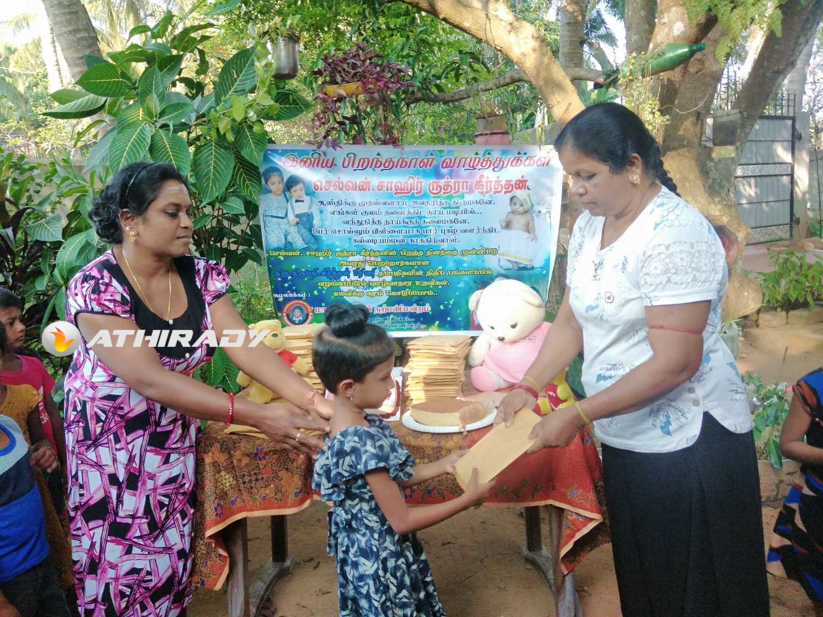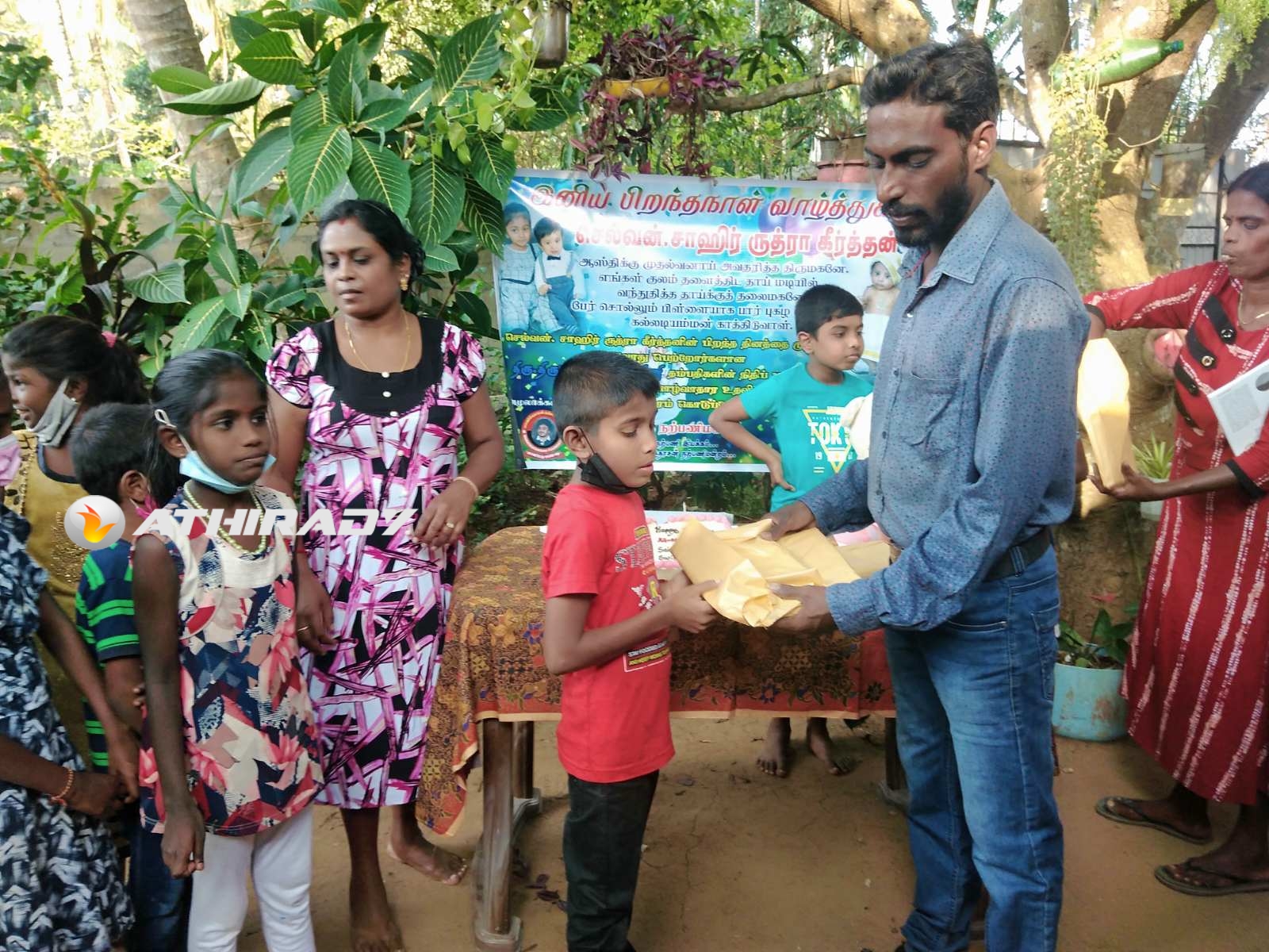 சுவிஸ் நாட்டில் வசிக்கும் திரு.திருமதி கீர்த்தன் பிரிணி தம்பதிகளின் செல்வப் புதல்வன் சாஹீர் ருத்ரா அவர்களது முதலாவது பிறந்த நாள் கொண்டாட்டம்.மாணிக்கதாசன் நற்பணி மன்றத்தின் ஓழுங்கமைப்பில் தாயக கிராம்மொன்றில் மிக விமர்சையாக கொண்டாடப்பட்டது. இந்நிகழ்வில் பொருந்தொகையான மாணவ மாணவிகள் தங்களின் பெற்றோர்களோடு வந்திருந்து பிறந்த நாளை சிறப்பித்தனர்.