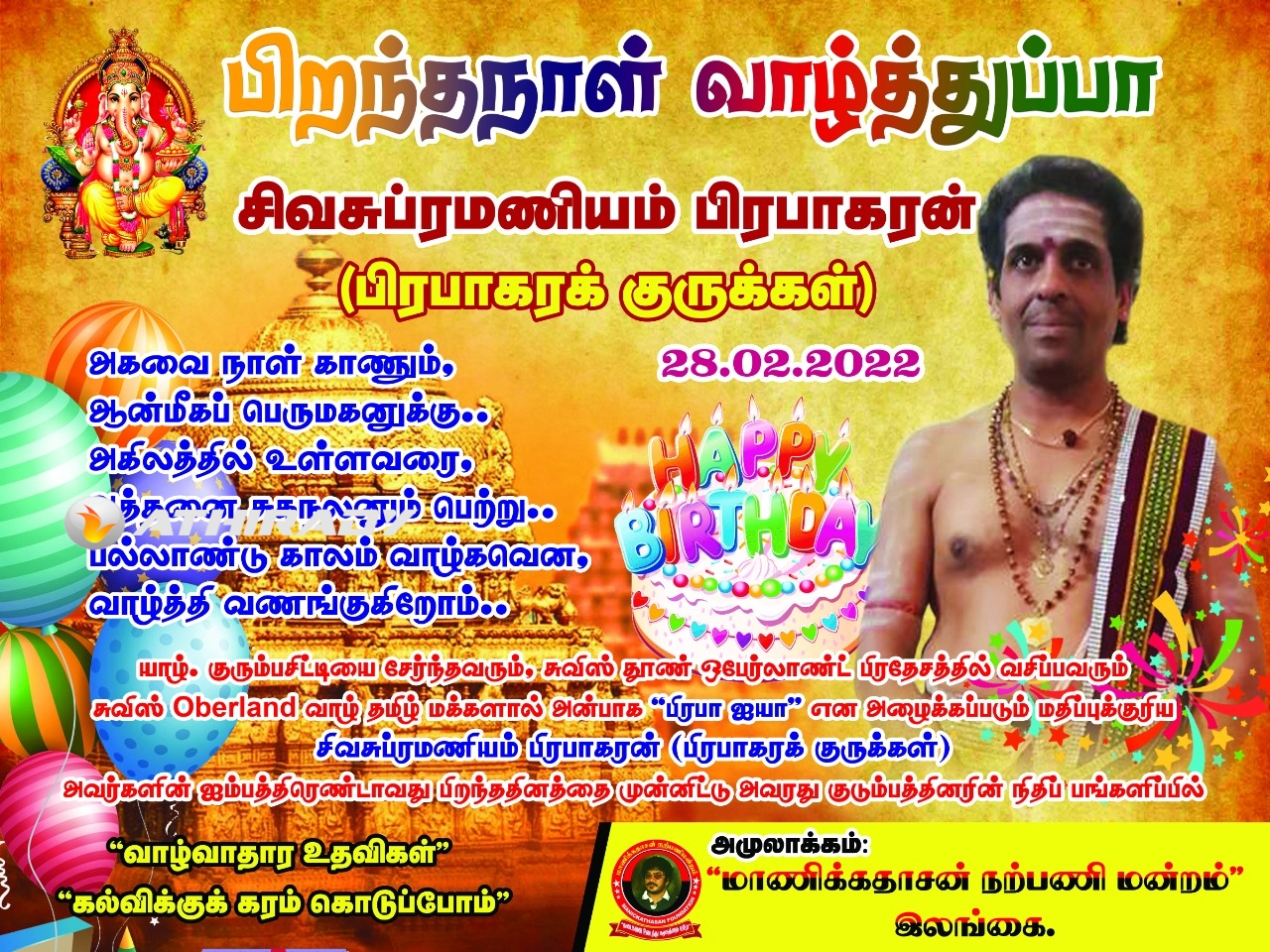 இன்றைய நாளில் பிறந்த நாளைக் கொண்டாடும் பிரபாகரக் குருக்களுக்கு இனிய பிறந்த நாள் வாழ்த்துக்களை தாயக உறவுகளோடு, மாணிக்கதாசன் நறபணி மன்றம் தெரிவித்துக் கொள்வதோடு, அவரது குடும்பத்தினரால் நிகழ்வுக்கு வழங்கப்பட்ட நிதிப் பங்களிப்புக்கும் மதிப்புடன் கூடிய நன்றியினைத்தெரிவித்துக் கொள்கிறது “மாணிக்கதாசன் நற்பணி மன்றம்”..