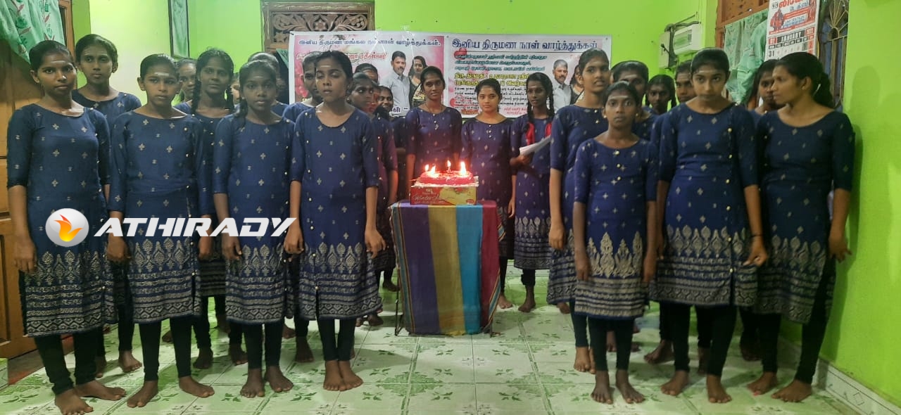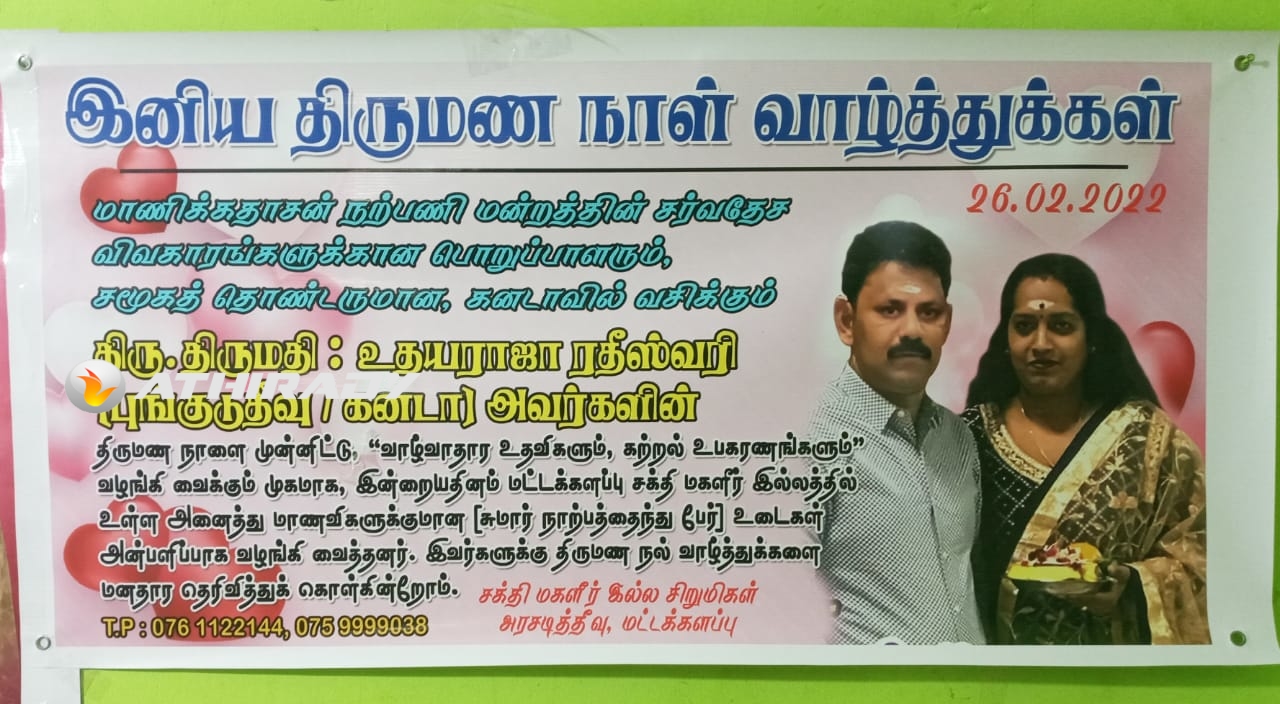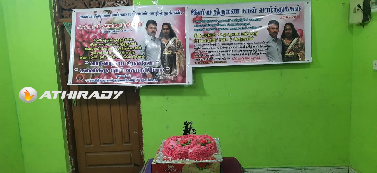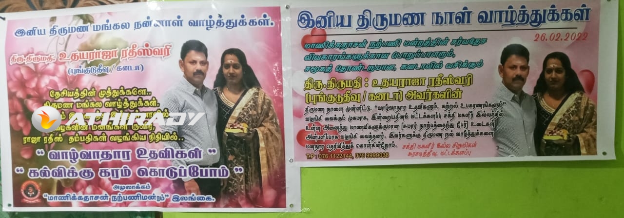 திருமண நாளைக் கொண்டாடும் மேற்படி கனடாவில் வசிக்கும் புலம்பெயர் உறவுகளான புங்குடுதீவைச் சேர்ந்த உதயராஜா ரதீஸ்வரி தம்பதிகளை “சக்தி மகளிர் இல்ல” சிறுமிகள், மற்றும் தாயக உறவுகளுடன் இணைந்து மாணிக்கதாசன் நற்பணி மன்றமும் வாழ்த்தி சந்தோஷமடைவதுடன், நிதிப்பங்களிப்பு வழங்கிய கனடாவில் வசிக்கும் உதயராஜா ரதீஸ்வரி குடும்பத்துக்கும் நன்றிகளைத் தெரிவித்துக் கொள்கின்றனர்.