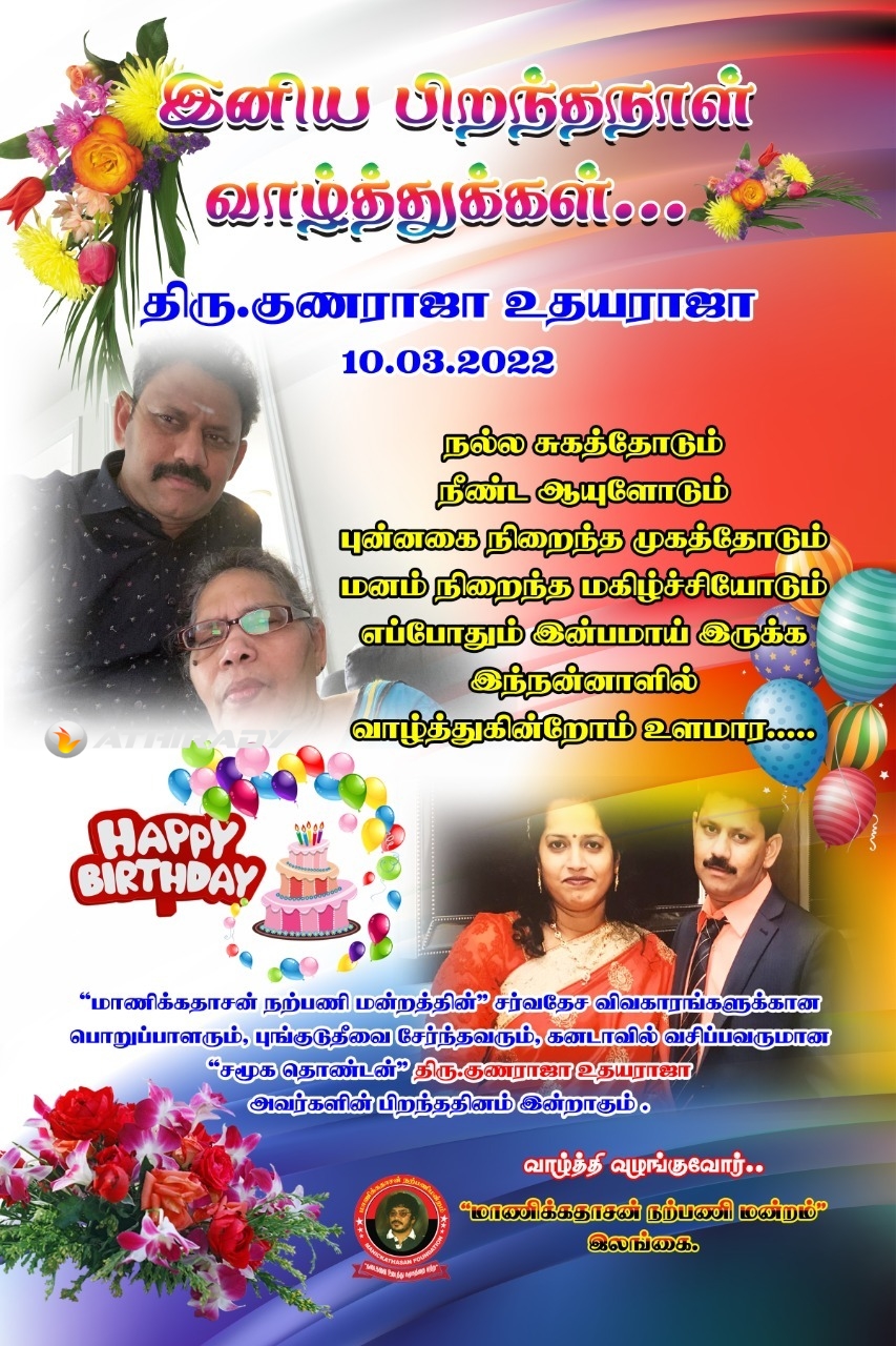 இன்றைய நாளில் பிறந்த நாளைக் கொண்டாடும் திரு.உதயராஜாவுக்கு இனிய பிறந்தநாள் வாழ்த்துக்களை தாயக உறவுகளோடு இணைந்து “மாணிக்கதாசன் நறபணி மன்றம்” தெரிவித்துக் கொள்கிறது