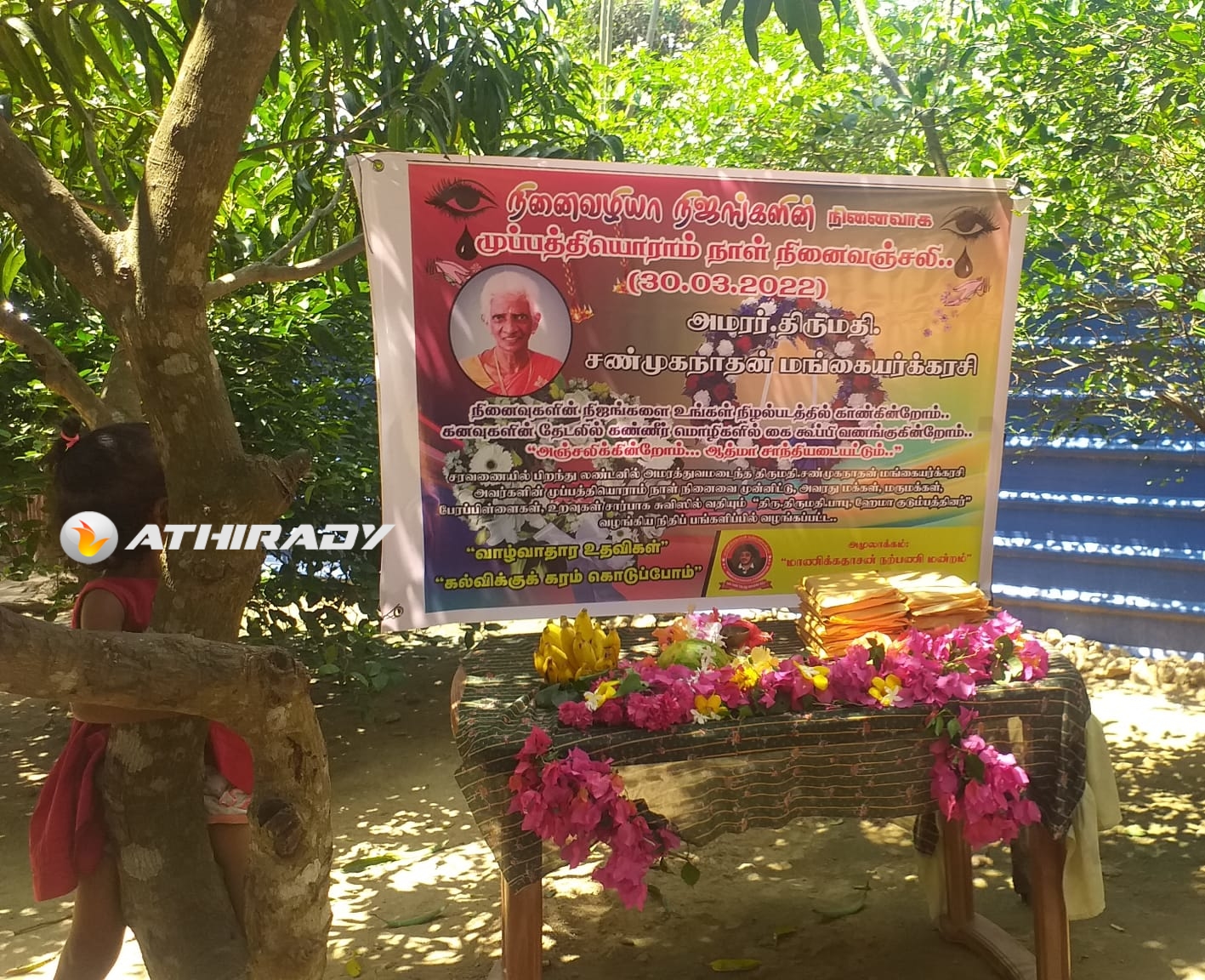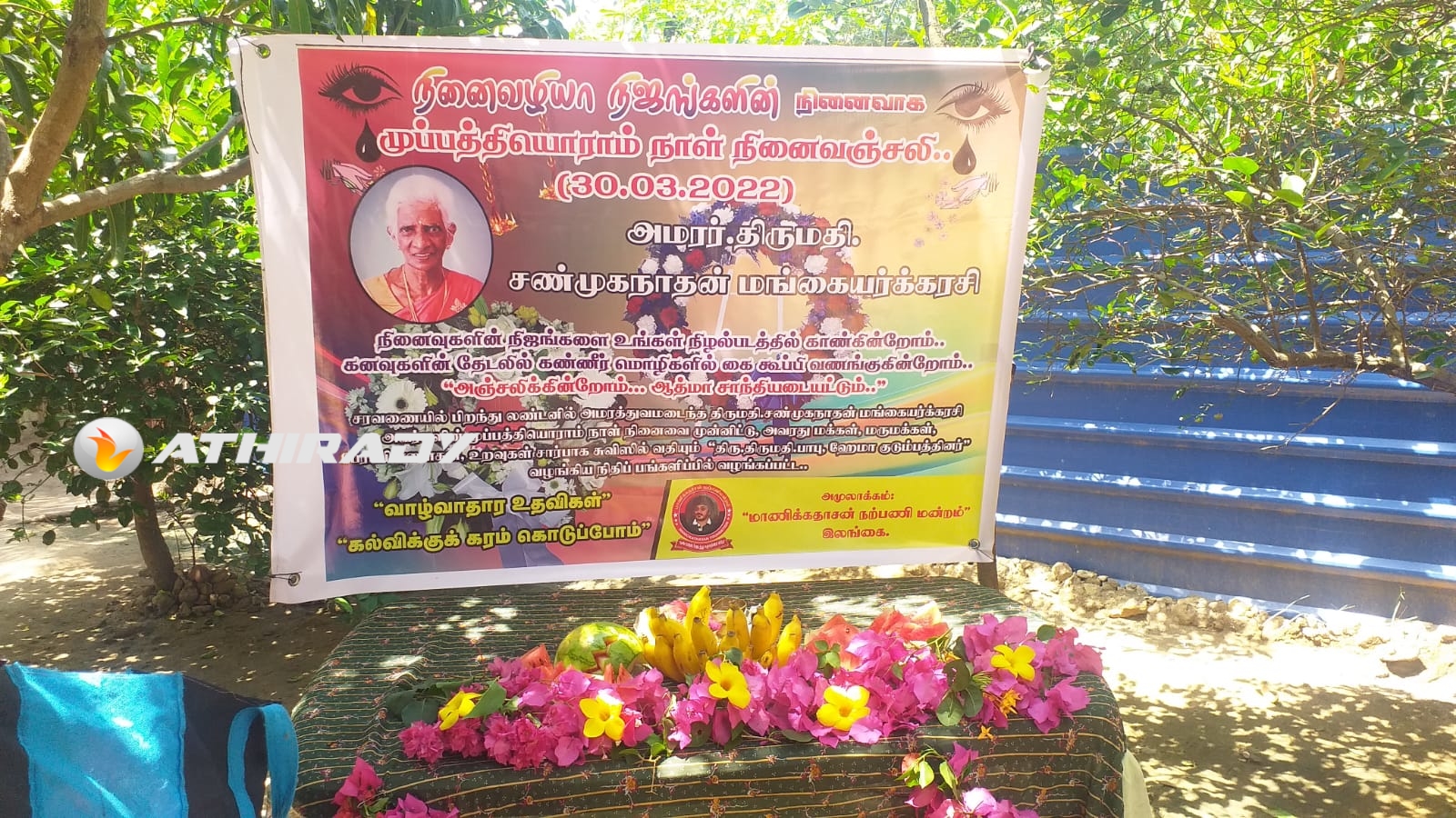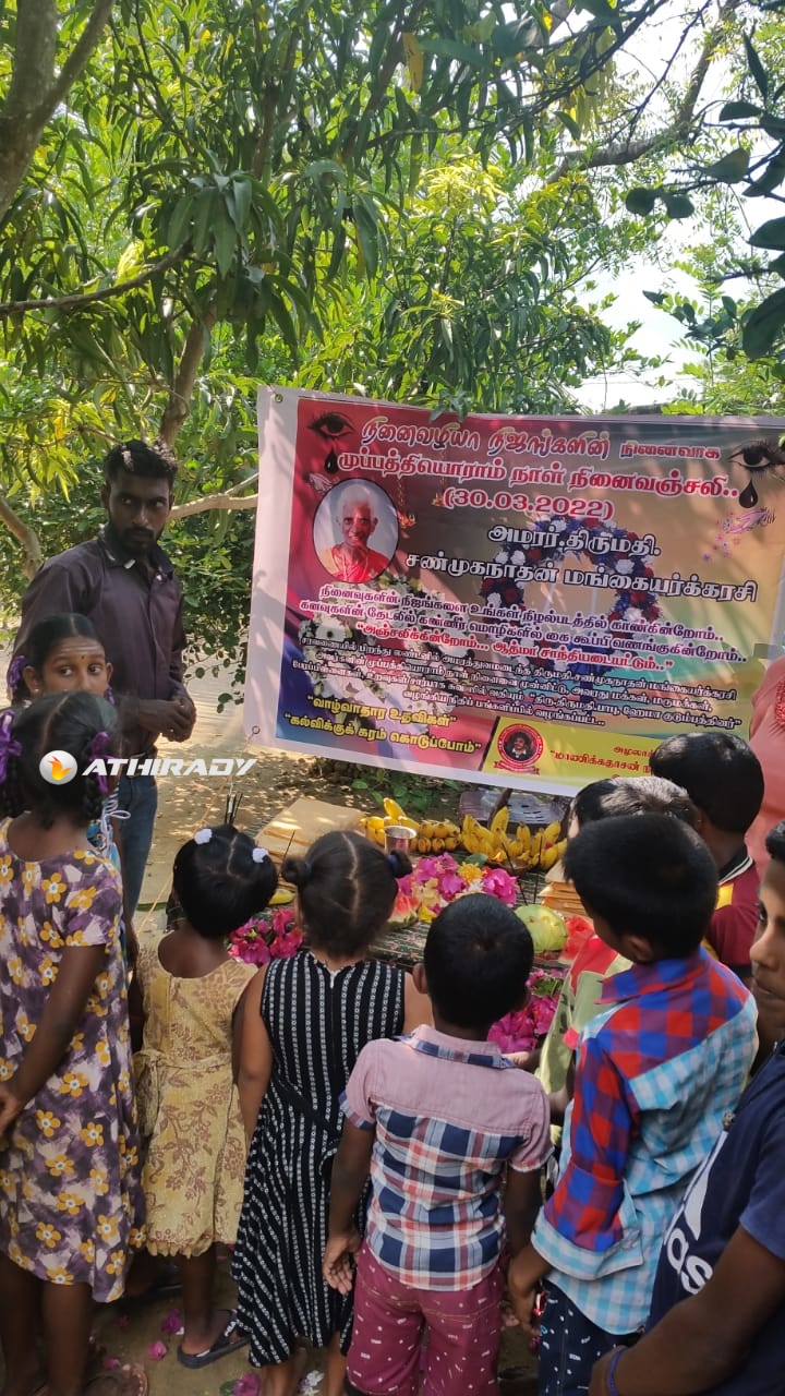 அமரத்துவமடைந்த அமரர்.திருமதி. சண்முகநாதன் மங்கையர்க்கரசி அவர்களுக்கு தாயக உறவுகளோடு, மாணிக்கதாசன் நற்பணி மன்றமும் ஆழ்ந்த இரங்கலோடு அஞ்சலி செலுத்துவதோடு அமரர் திருமதி. சண்முகநாதன் மங்கையர்க்கரசி அவர்களது 31 ஆம் நாள் நினைவாக அனுஸ்டிக்கப்பட்டு, 31 ஆம் நாள் அந்தியேட்டி நிகழ்வுக்கு நிதிப்பங்களிப்பினை வழங்கிய அன்னாரது மகனான சுவிஸில் வதியும் திரு.திருமதி பாபு ஹேமா குடும்பத்தினருக்கு மாணிக்கதாசன் நற்பணி மன்றம் தனது நன்றியினைத் தெரிவித்துக் கொள்கிறது.
