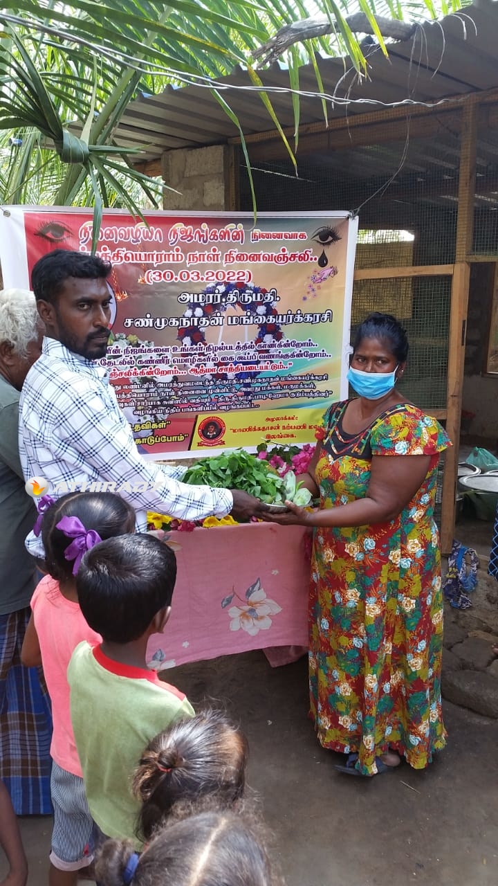 இதனை அடுத்து இன்று மதியம் அமரத்துவமடைந்த திருமதி.. சண்முகநாதன் மங்கையர்க்கரசி அவர்களின் முப்பத்தியொராம் நாள் நினைவை முன்னிட்டு, மூன்றாவது நிகழ்வாக வவுனியா கிராமமொன்றில் அவ்வூர் மக்களுக்கு விசேட உணவு வழங்கப்பட்ட்து.