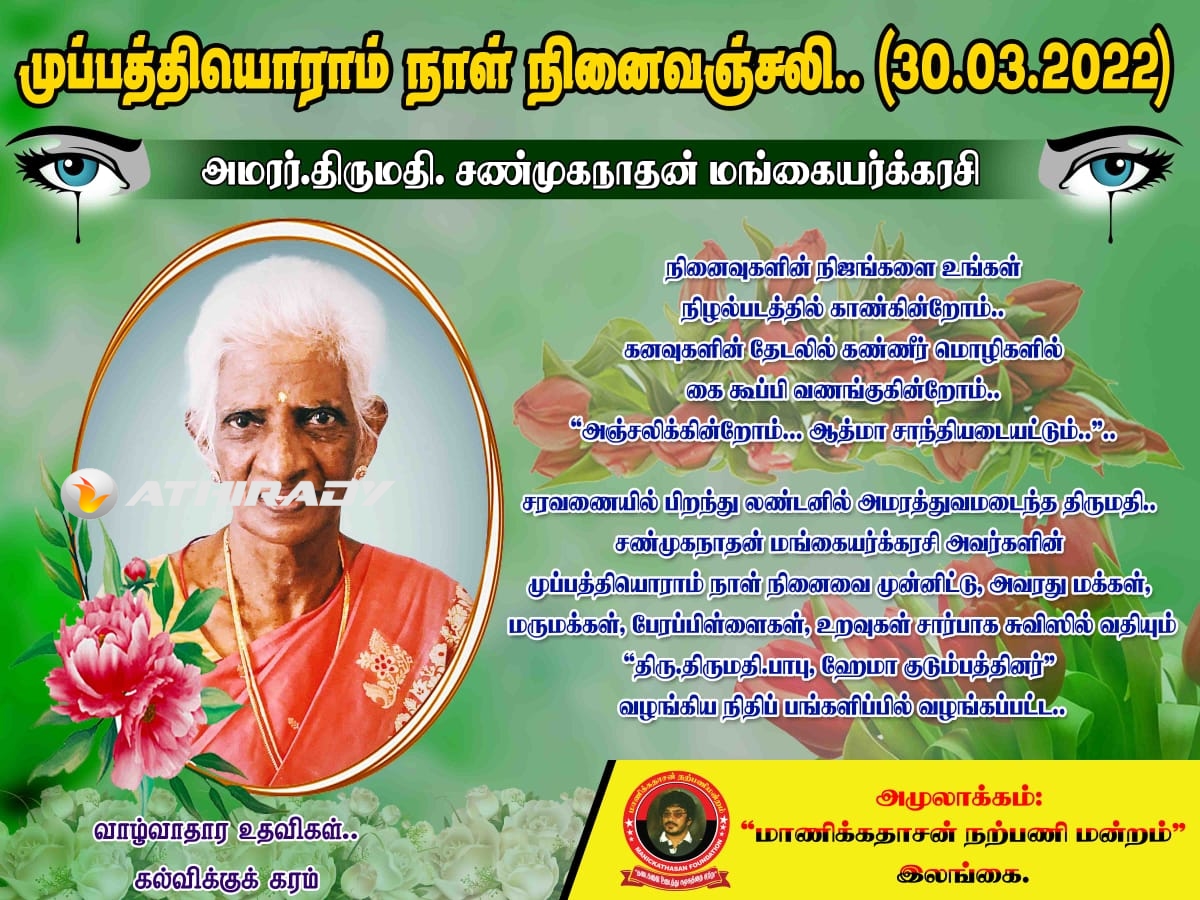அமரத்துவமடைந்த அமரர்.திருமதி. சண்முகநாதன் மங்கையர்க்கரசி அவர்களுக்கு தாயக உறவுகளோடு, மாணிக்கதாசன் நற்பணி மன்றமும் ஆழ்ந்த இரங்கலோடு அஞ்சலி செலுத்துவதோடு அமரர் திருமதி. சண்முகநாதன் மங்கையர்க்கரசி அவர்களது 31 ஆம் நாள் நினைவாக அனுஸ்டிக்கப்பட்டு, 31 ஆம் நாள் அந்தியேட்டி நிகழ்வுக்கு நிதிப்பங்களிப்பினை வழங்கிய அன்னாரது மகனான சுவிஸில் வதியும் திரு.திருமதி பாபு ஹேமா குடும்பத்தினருக்கு மாணிக்கதாசன் நற்பணி மன்றம் தனது நன்றியினைத் தெரிவித்துக் கொள்கிறது.