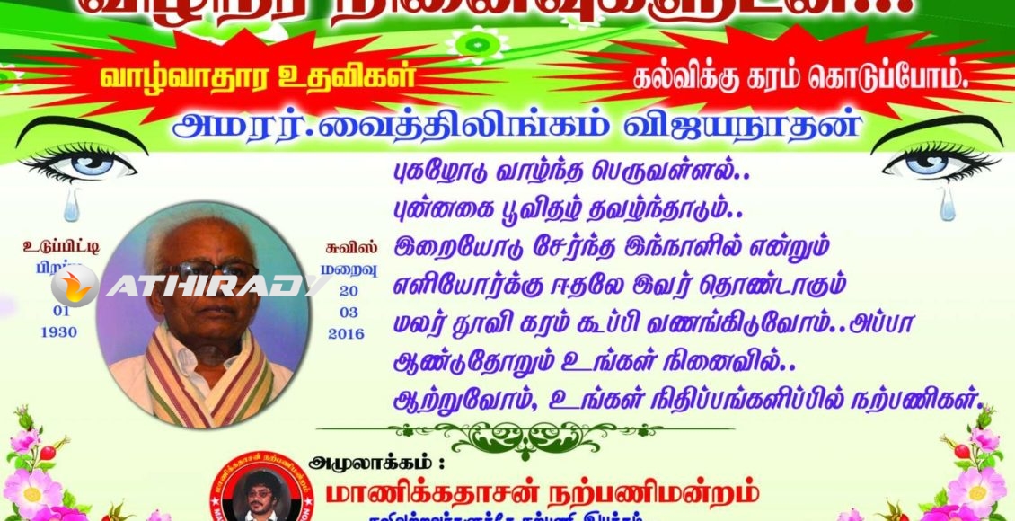 சுவிஸ் அமரர் வை.விஜயநாதன் அவர்களின் ஆறாமாண்டு நினைவாக விசேட உணவு வழங்கல்.. (படங்கள் வீடியோ) யாழ். உடுப்பிட்டியை சேர்ந்தவரும் சுவிஸில் அமரத்துவமடைந்தவருமான அமரர் வைத்திலிங்கம் விஜயநாதன் அவர்களின் ஆறாமாண்டு நினைவாக கணேசபுரம் கிராமத்தில் உள்ள காளி கோயில் முன்றலில் “முதல் நிகழ்வாக” நிகழ்வில் கலந்து கொண்ட கிராம மக்களுக்கு விசேட உணவு வழங்கப்பட்டது. மேற்படி நிகழ்வில் அக்கிராம மற்றும் சுற்றுவட்டார கிராமங்களை சேர்ந்த சமுர்த்தி தலைவி திருமதி.ஜெயதேவி, சமுர்த்தி தலைவி திருமதி.நி.விசிர்ரேஷன், மாதர் சங்க தலைவி திருமதி.செ.சிவசோதி, … Continue reading சுவிஸ் அமரர் வை.விஜயநாதன் அவர்களின் ஆறாமாண்டு நினைவாக, விசேட உணவு வழங்கல்.. (படங்கள் வீடியோ)