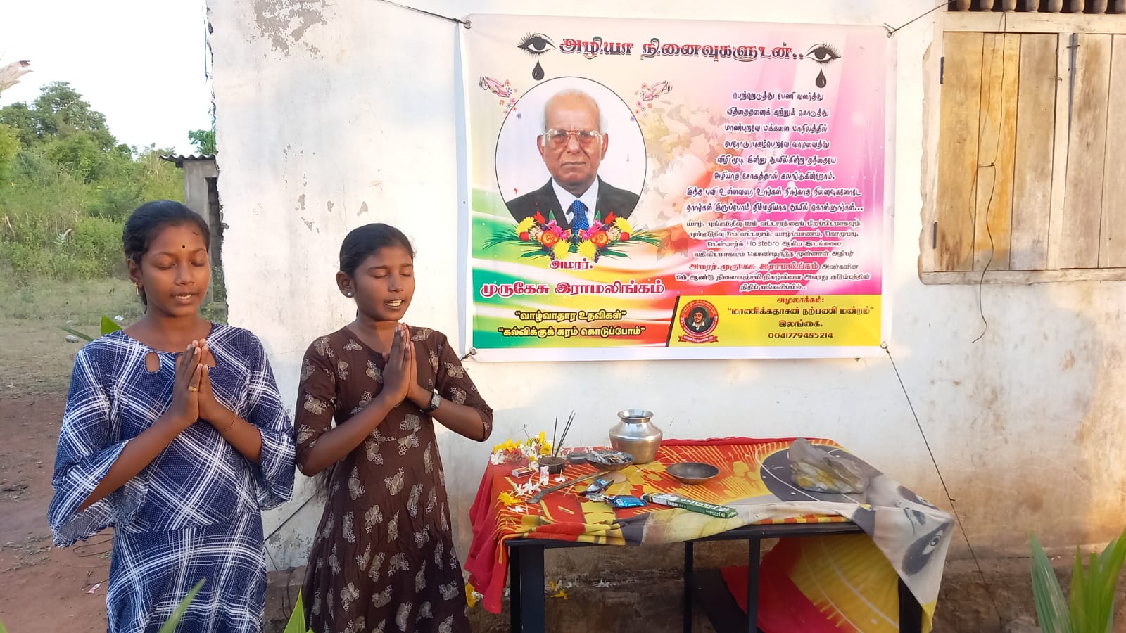 அமரத்துவமடைந்த அமரர்.திரு.முருகேசு இராமலிங்கம் அவர்களுக்கு தாயக உறவுகளோடு, மாணிக்கதாசன் நற்பணி மன்றமும் ஆழ்ந்த இரங்கலோடு அஞ்சலி செலுத்துவதோடு அமரர்.திரு.முருகேசு இராமலிங்கம் அவர்களின் ஆறாம் ஆண்டு நினைவு நிகழ்வுக்கு நிதிப் பங்களிப்பினை வழங்கிய அவரது குடும்பத்தினருக்கு தாயக உறவுகளுடன் இணைந்து “மாணிக்கதாசன் நற்பணி மன்றமும்” தனது மேலான நன்றியினைத் தெரிவித்துக் கொள்கிறது.
