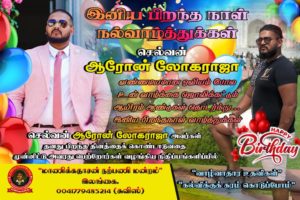 இன்றைய நாளில் இனிய பிறந்த நாளைக் கொண்டாடும் திரு.ஆரோன் அவர்களை பல்கலையும் பதினாறும் பெற்று பல்லாண்டு காலம் சீறும் சிறப்புடன் வாழ்க வாழ்கவென மாணிக்கதாசன் நற்பணி மன்றமும் தாயகத்து உறவுகளோடு இணைந்து வாழ்த்துகிறது.