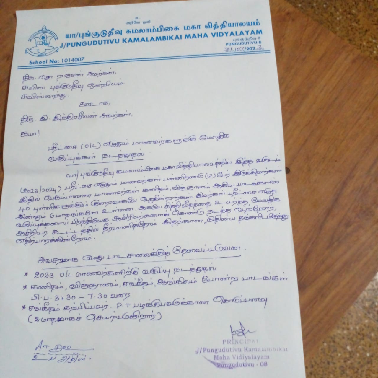 யா/புங்குடுதீவு.கமலாம்பிகை மகா வித்தியாலயத்தில் தரம்-11 மாணவர்களுக்கு மேலதிக கற்றல் செயற்பாடாக கணித பாடம் யாழ்ப்பாணத்தில் உள்ள பிரபல பாடசாலையில் கற்பிக்கின்ற ஆசிரியரால் இன்று நடத்தப்பட்டது. மேற்படி கற்பித்தல் நிகழ்வில் அதிபர், உபஅதிபர் ஆகியோரும் கலந்து சிறப்பித்தனர். அதே போல் நாளை விஞ்ஞான பாடமும் நடைபெறவுள்ளது.