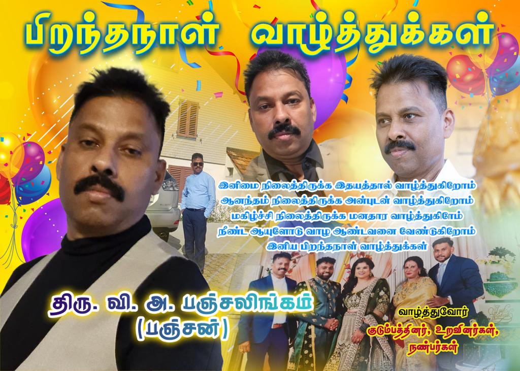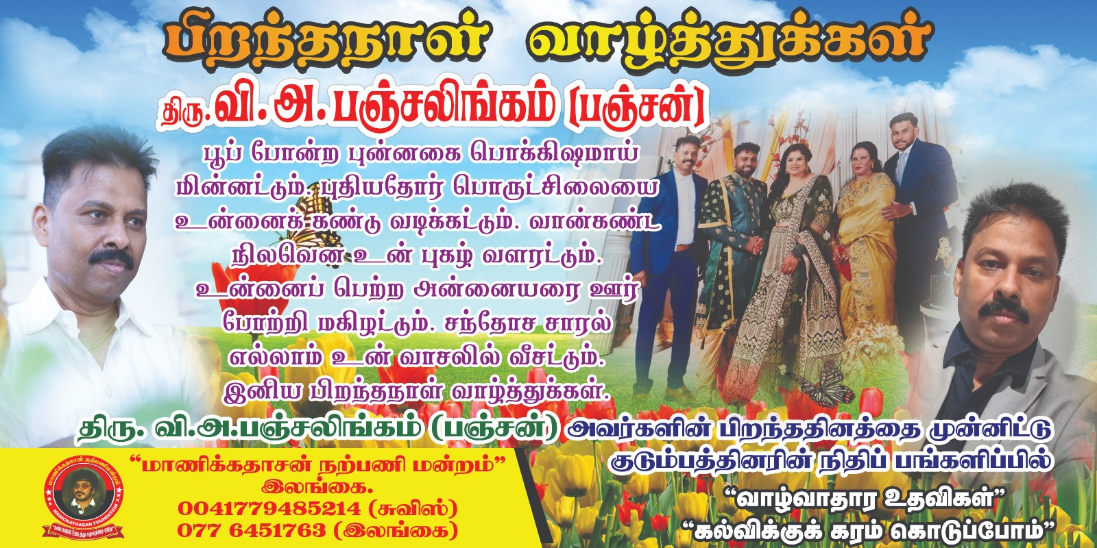 இன்றைய நாளில் இனிய பிறந்த நாளைக் கொண்டாடும் திரு.பஞ்சலிங்கம் அவர்களை “பல்லாண்டு காலம் சீரும் சிறப்புடன் வாழ்க வாழ்கவென” மாணிக்கதாசன் நற்பணி மன்றம் தாயகத்து உறவுகளோடு இணைந்து வாழ்த்துகிறது.