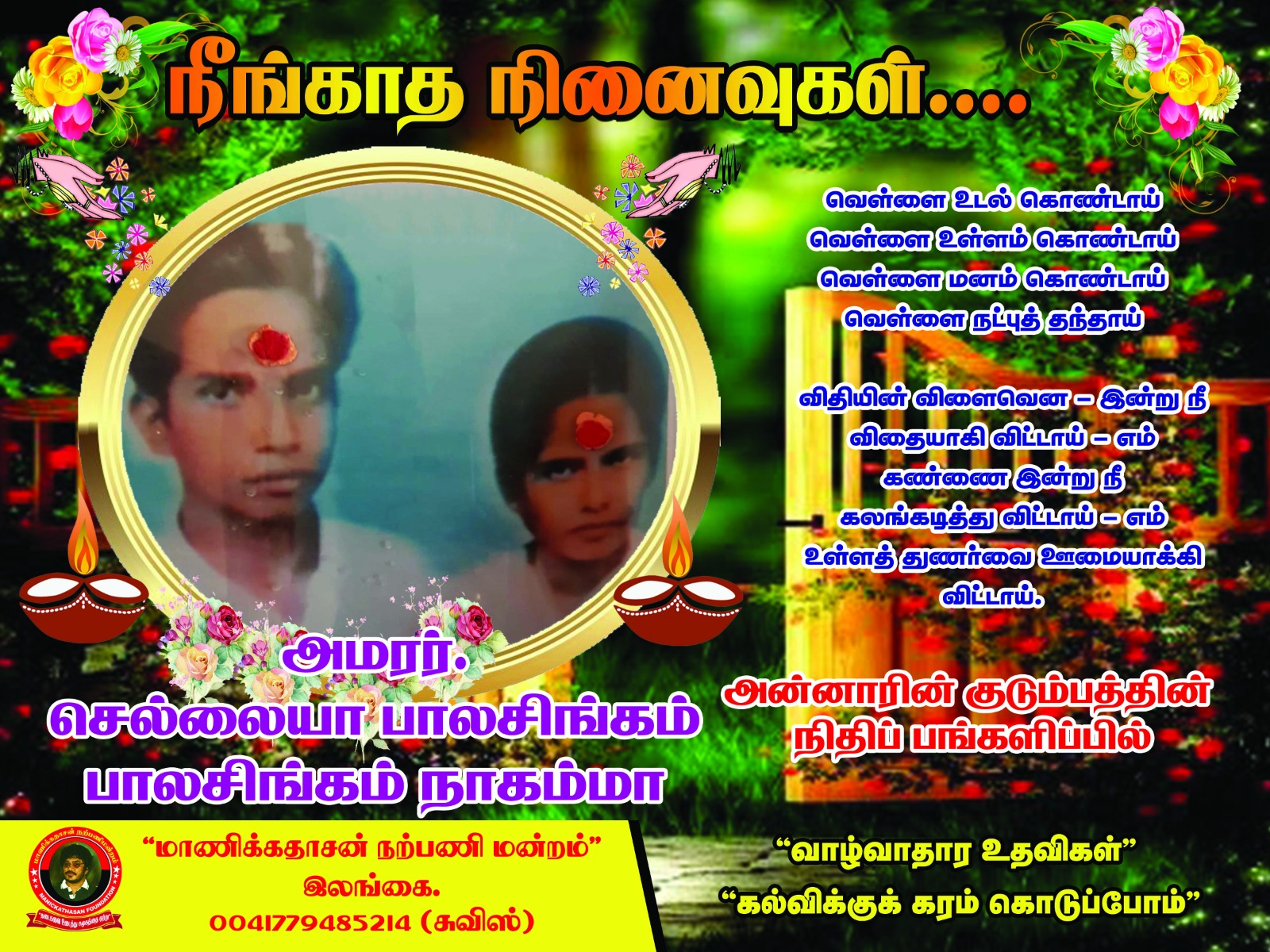 அமரத்துவமடைந்த திரு.செல்லையா பாலசிங்கம், திருமதி. பாலசிங்கம் நாகம்மா, ஆகியோரின் ஆத்மசாந்திக்காக எல்லாம்வல்ல இறைவனை தாயக உறவுகளோடு இணைந்து “மாணிக்கதாசன் நற்பணி மன்றம்” வேண்டி கொள்கிறது.