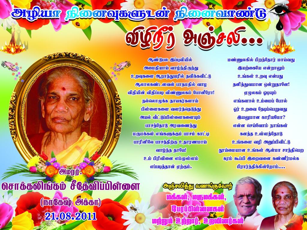 தொடர்ந்து மாணிக்கதாசன் நற்பணி மன்றத்தோடு நிதிப்பங்களிப்பு தந்து, சமூகப்பணியில் ஈடுபட்டுக் கொண்டிருக்கும் அமரர்.சொக்கலிங்கம் குடும்பத்தினருக்கு மாணிக்கதாசன் நற்பணி மன்றமும் தாயக சொந்தங்களோடு இணைந்து நன்றியைத் தெரிவித்துக் கொள்வதோடு, இறையடி சேர்ந்த “நாகேஷ் அக்கா” எனும் அமரர் சொக்கலிங்கம் சீதேவிப்பிள்ளை அவர்களின் ஆத்மா சாந்தியடைய எந்நாளும் இறைவனை இறைஞ்சு வேண்டுகிறோம்.