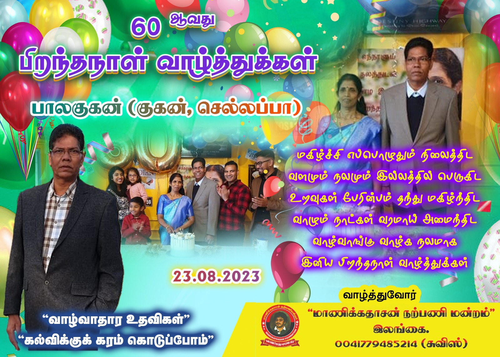 இன்றைய நாளில் பிறந்த நாளைக் கொண்டாடும் பாலகுகன் அவர்களுக்கு நிகழ்வில் கலந்து கொண்ட சிறியோர் முதல் பெரியோர் வரையான தாயக உறவுகளோடு மாணிக்கதாசன் நற்பணி மன்றமும் தனது இனிய பிறந்தநாள் வாழ்த்துக்களை தெரிவித்துக் கொள்வதோடு மாணிக்கதாசன் நற்பணி மன்றமூடாக வாழ்வாதார உதவிகள் வழங்கி தாயக மக்களுடன் இணைந்து முன்னெடுத்து வரும் சமூக நற்பணிகளுக்காக வாழ்த்துக்களையும் நன்றிகளையும் தெரிவித்துக் கொள்கிறது.