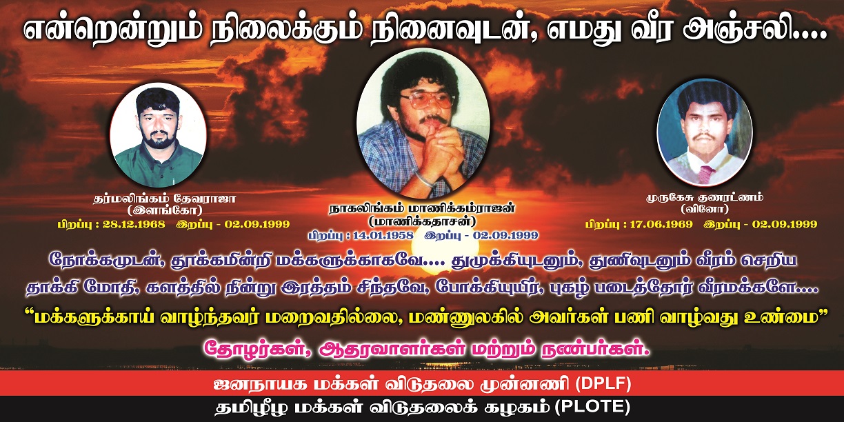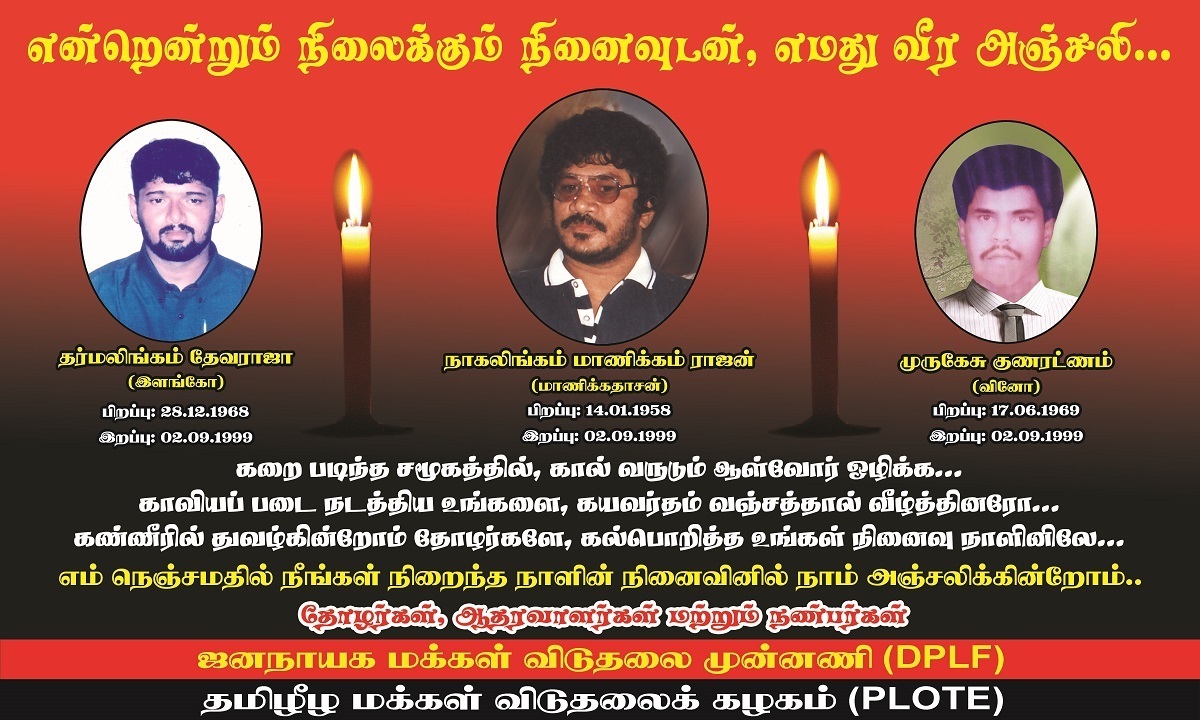அதேவேளை அமரத்துவமடைந்த தளபதி தோழர் மாணிக்கதாசன்.. மற்றும் தோழர் இளங்கோ தோழர் வினோஆகிய கழக கண்மணிகளுக்கு தாயக உறவுகளுடன் இணைந்து வீரவணக்க அஞ்சலிகளையும் தெரிவித்துக் கொள்கிறது.