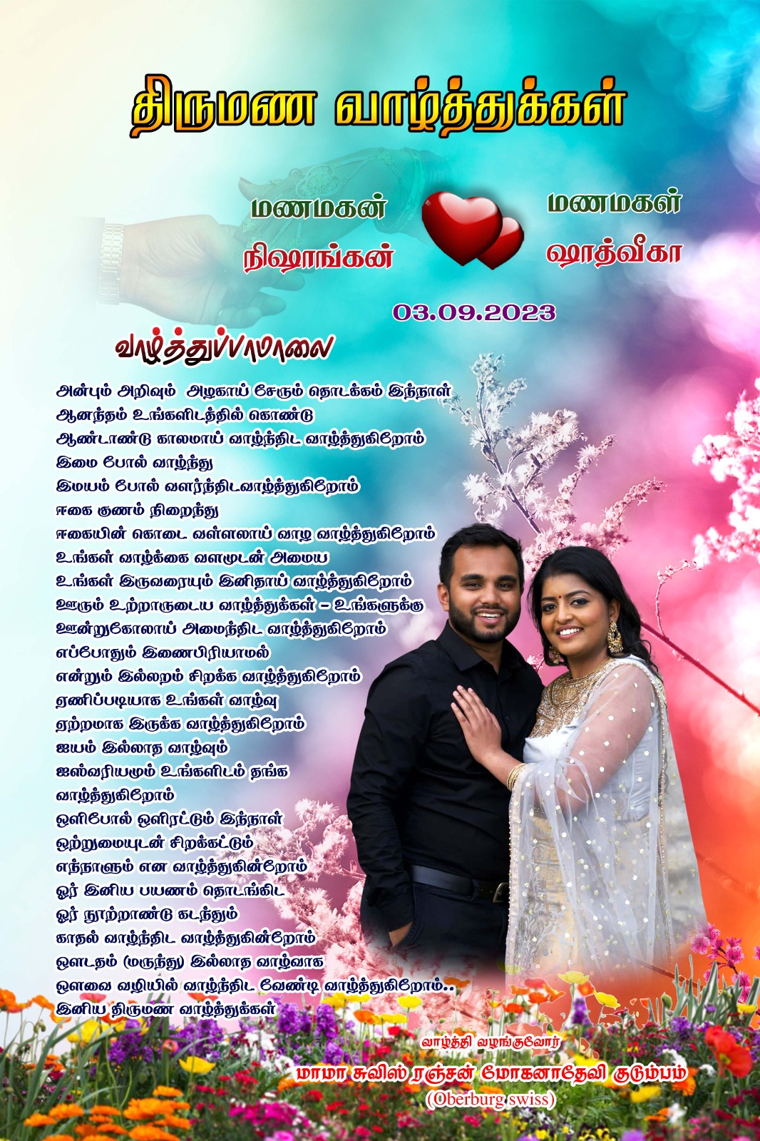 சுவிஸில் இன்றைய நாளில் திருமண பந்தத்தில் இணையும் “நிஷாங்கன், சாத்விகா” தம்பதிகளின் திருமணக் கொண்டாட்டம் மாணிக்கதாசன் நற்பணி மன்றத்தின் ஒழுங்கமைப்பில் தாயக கிராமமொன்றில் கொண்டாடப்பட்டது.