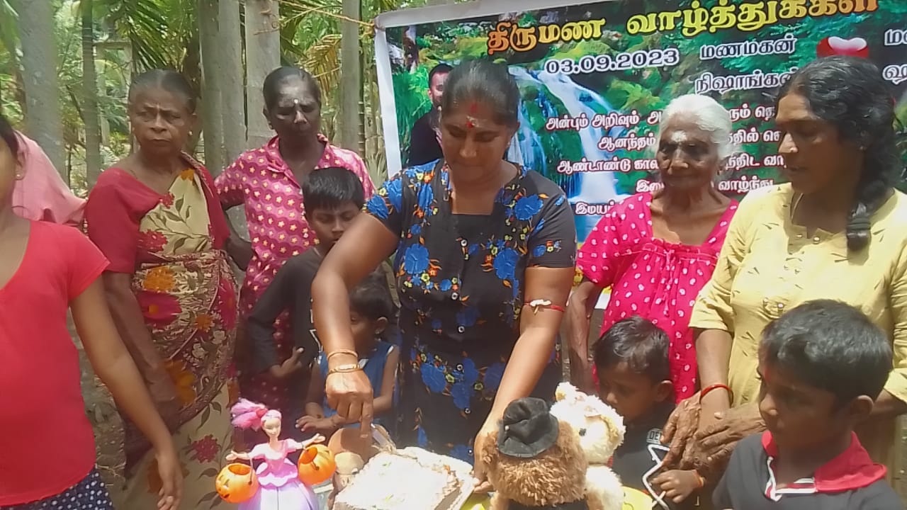 நிஷாங்கன், சாத்விகா தம்பதிகளின் திருமண நாளில் அவர்களின் நிதிப்பங்களிப்பில் முதலில் திருமண கேக் வெட்டப்பட்டு, தம்பதிகளுக்கு வாழ்த்துக்கள் தெரிவிக்கப்பட்டதுடன் கிராம மக்களுக்கான திருமண விருந்துபசார நிகழ்வும் நிஷாங்கன், சாத்விகா தம்பதிகளின் விருப்பத்துக்கு இணங்க கோழி இறைச்சியுடனான விசேட அசைவ மதிய உணவும் விசேடமாக ஒழுங்குபடுத்தி நடைமுறை படுத்தப்பட்டது.