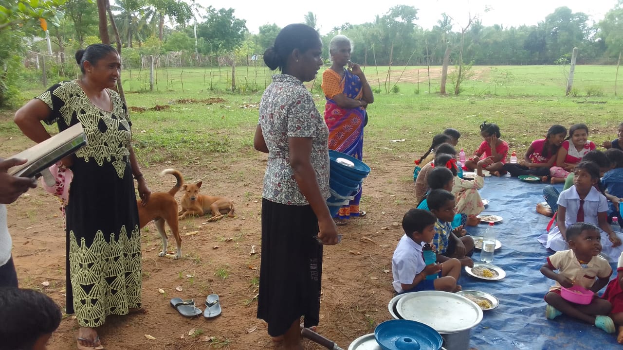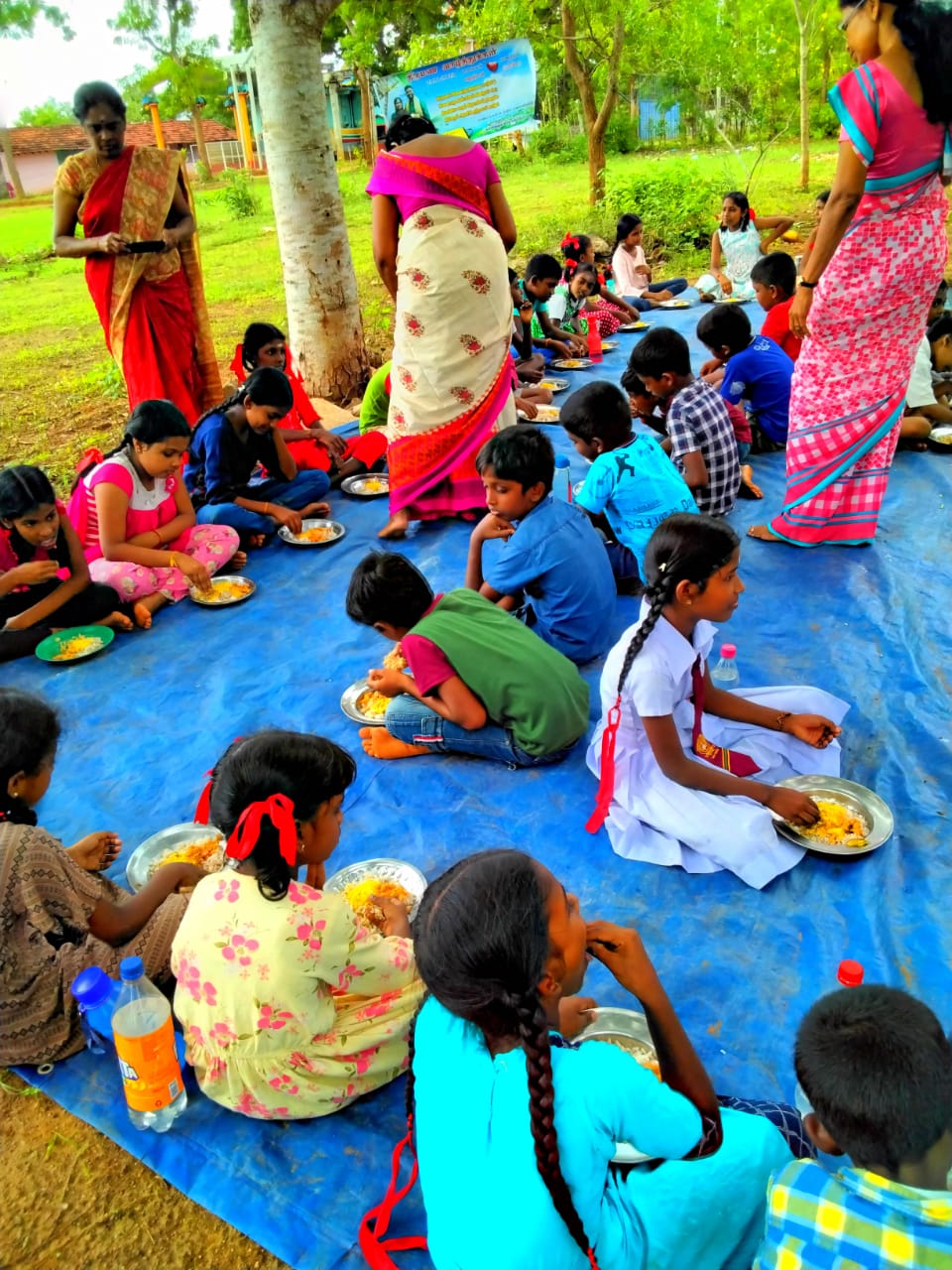 அவ்வாறே புதுத் தம்பதிகள் தமது திருமணத்தை தாயக உறவுகளோடு கொண்டாட வேண்டி மாணிக்கதாசன் நற்பணி மன்றத்திடம் கேட்டுக் கொண்டதிற்கிணங்க சிறப்பாக விசேட மதியஉணவு வழங்க வேண்டும் எனக் கேட்டுக் கொண்டதிற்கிணங்க இன்றைய நாளில் “மாணிக்கதாசன் நற்பணி மன்றத்தின்” நிர்வாக சபை உறுப்பினரும், முக்கியஸ்தருமான திருமதி நவரத்தினம் பவளராணி அவர்களின் நேர்த்தியான ஒழுங்கமைப்பில், மாணவ மாணவிகள், சிறுவர், சிறுமிகள் அவர்களின் பெற்றோர்கள், அங்கு வாழும் குடும்பங்களுக்கு விசேட மதிய உணவு வழங்கப்பட்டது. மேற்படி நிகழ்வில் நூற்றுக்கணக்கான மக்கள் கலந்து சிறப்பித்தனர்.