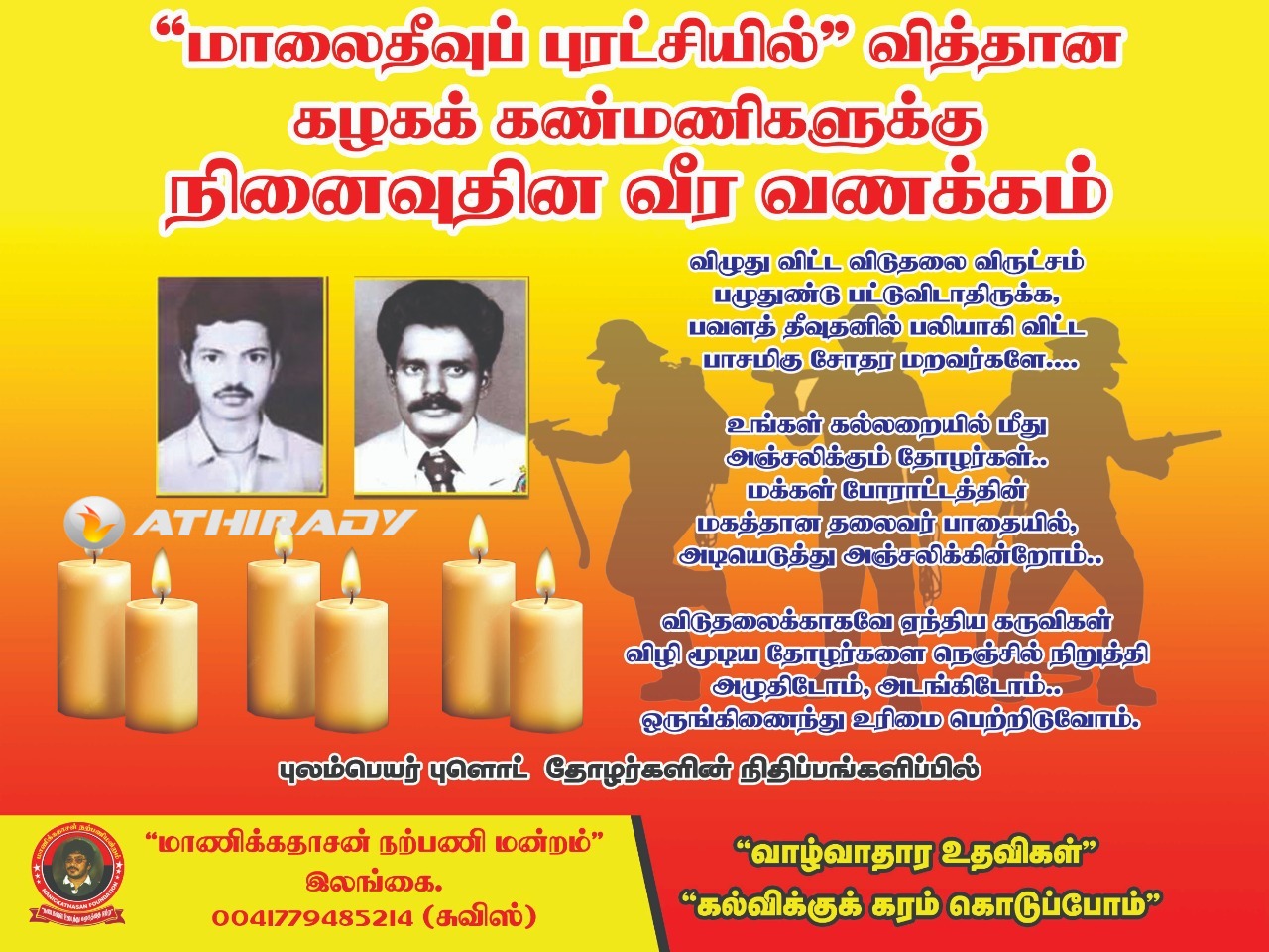 மக்களுக்காகவும், மண்ணுக்காகவும் மரணித்த மேற்படி வீரமக்களின் முப்பத்தி ஐந்தாம் வருட நினைவு நாளை முன்னிட்டு, “மாணிக்கதாசன் பவுண்டேசன்” அமைப்பின் ஊடாக புலம்பெயர் புளொட் தோழர்களின் நிதிப் பங்களிப்பில் வவுனியா எல்லைக் கிராமமொன்றில் மேற்படி நிகழ்வு நடத்தப்பட்டது. மாணிக்கதாசன் நற்பணி மன்ற வவுனியா மாவட்ட இணைப்பாளர் திரு.பெருமாள் சஞ்சீவன் அவர்களின் தலைமையில் மன்றத்தின் கிராமிய இணைப்பாளர்களின் ஒழுங்கமைப்பில் நடத்தப்பட்ட மேற்படி நிகழ்வில்,..