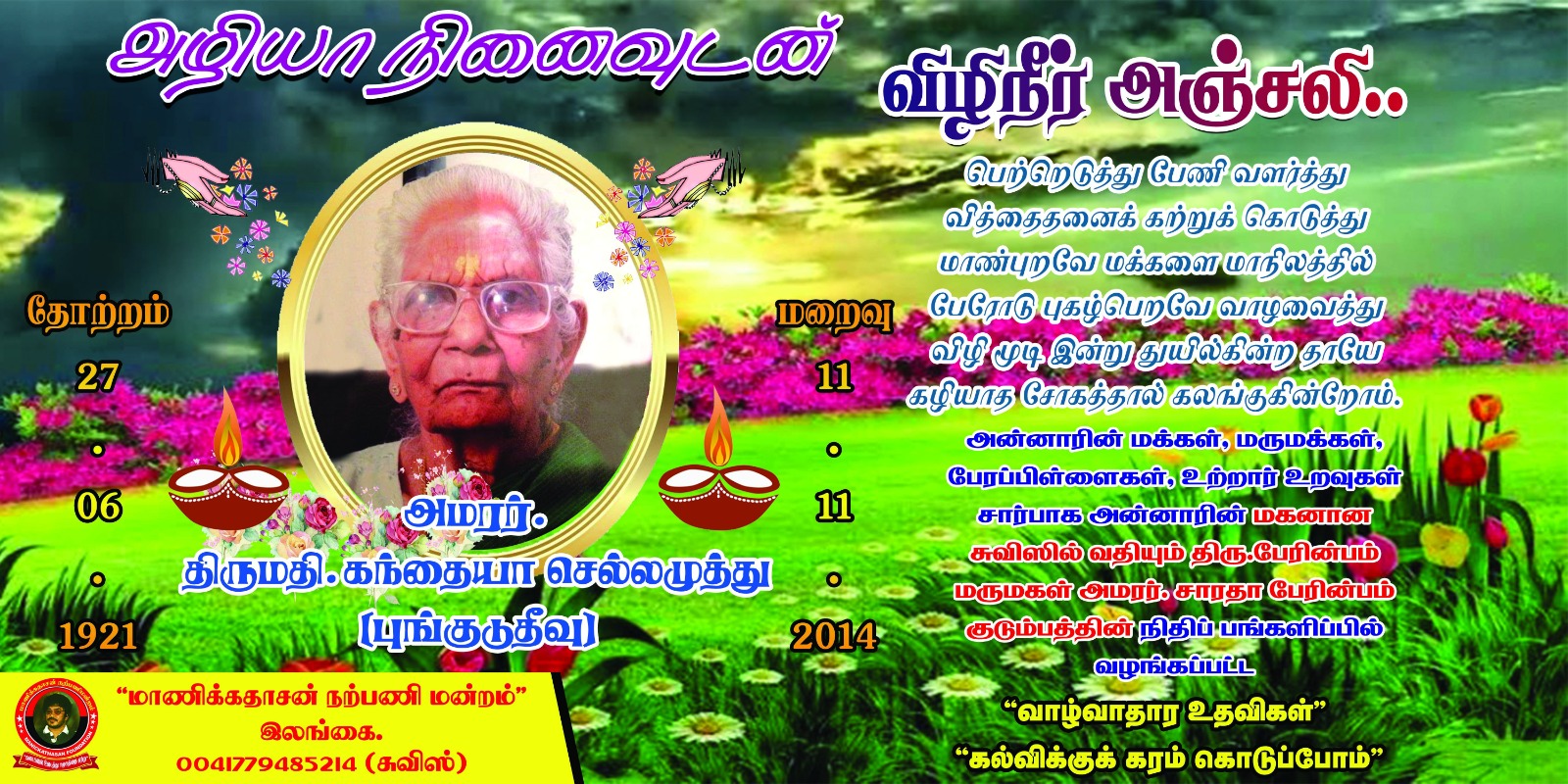 அமரத்துவமடைந்த அமரர். கந்தையா செல்லமுத்து அவர்களுக்கு தாயக உறவுகளோடு, மாணிக்கதாசன் நற்பணி மன்றமும் ஆழ்ந்த இரங்கலோடு “அவரின் ஆத்மா சாந்தியடைய வேண்டி” அஞ்சலி செலுத்துவதோடு
