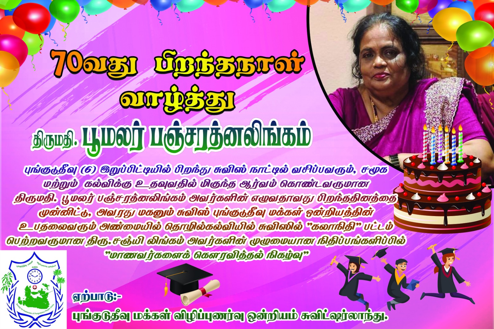 சமூக உதவி மற்றும் கல்விக்கு உதவுதலில் தன்னார்வம் கொண்ட புங்குடுதீவு இறுப்பிட்டியில் பிறந்து சுவிஸில் வதியும் திருமதி. பூமலர் பஞ்சரத்னலிங்கம் அவர்களின் எழுபதாவது பிறந்ததினத்தை முன்னிட்டு அவரது மகனும், சுவிஸ் ஒன்றிய உபதலைவருமான “கலாநிதி” திரு.சஞ்சீ லிங்கம் குடும்பத்தின் முழுமையான நிதிப் பங்களிப்பில் “சுவிஸ் புங்குடுதீவு ஒன்றியத்தின்” ஏற்பாட்டில் “புங்குடுதீவு மாணவர்களுக்கான கௌரவிப்பு”..நிகழ்வு இன்றையதினம் (10.12.2023) பலத்த மழைக்கு மத்தியில் புங்குடுதீவு அம்பலவாணர் அரங்கில் சிறப்பாக நடைபெற்றது.